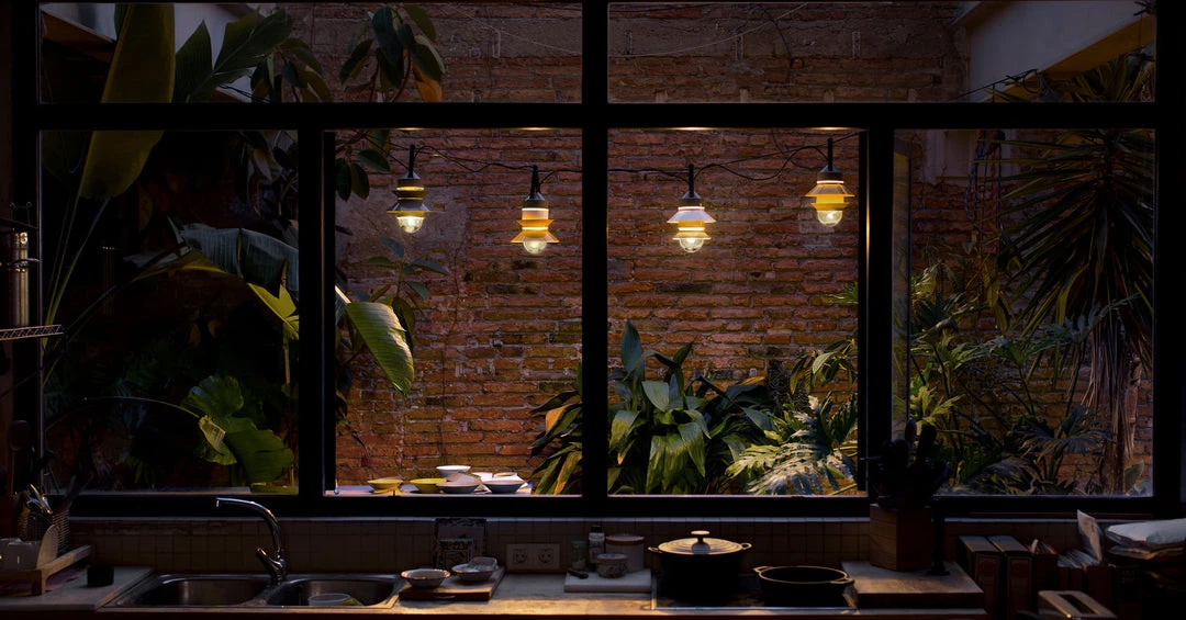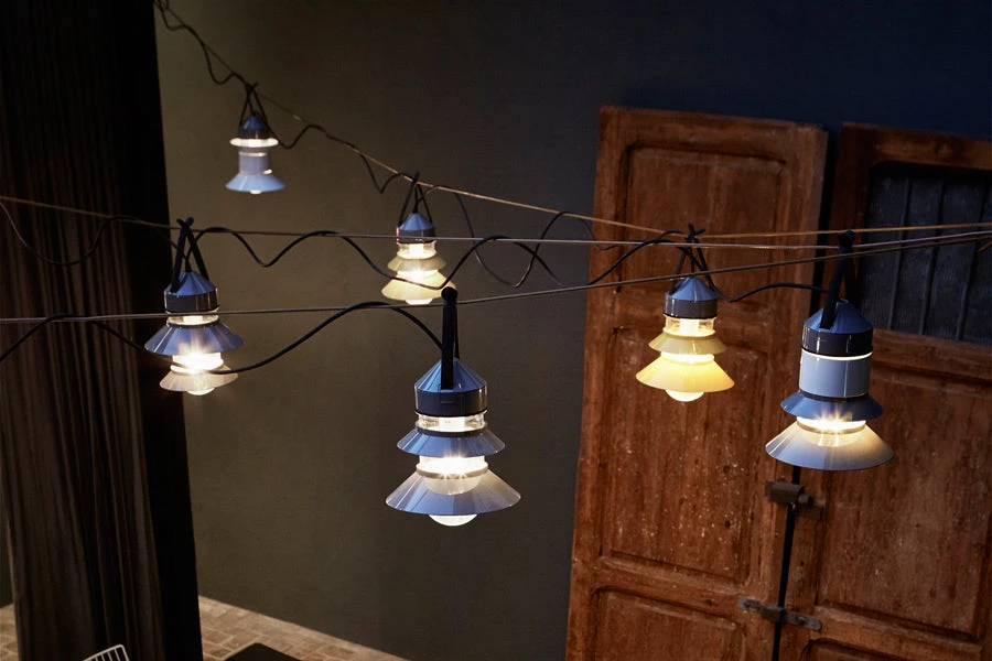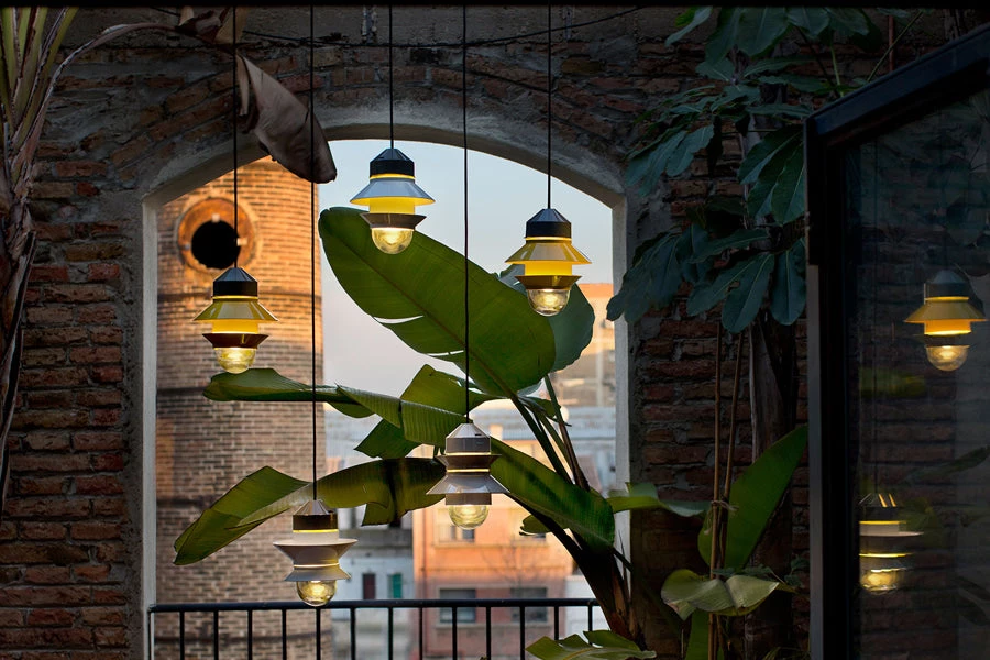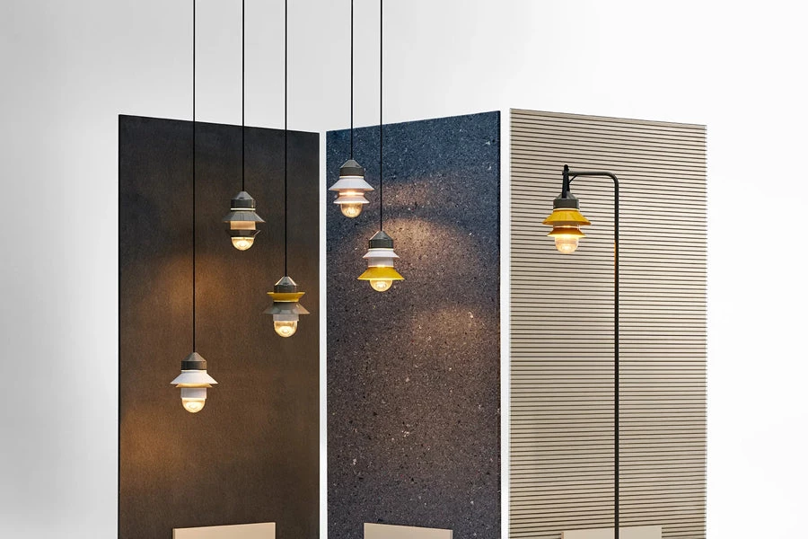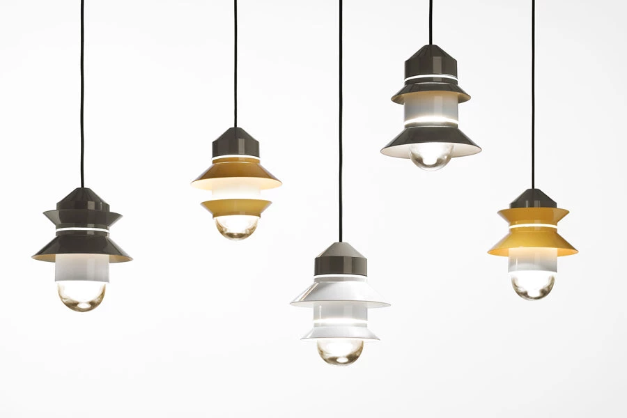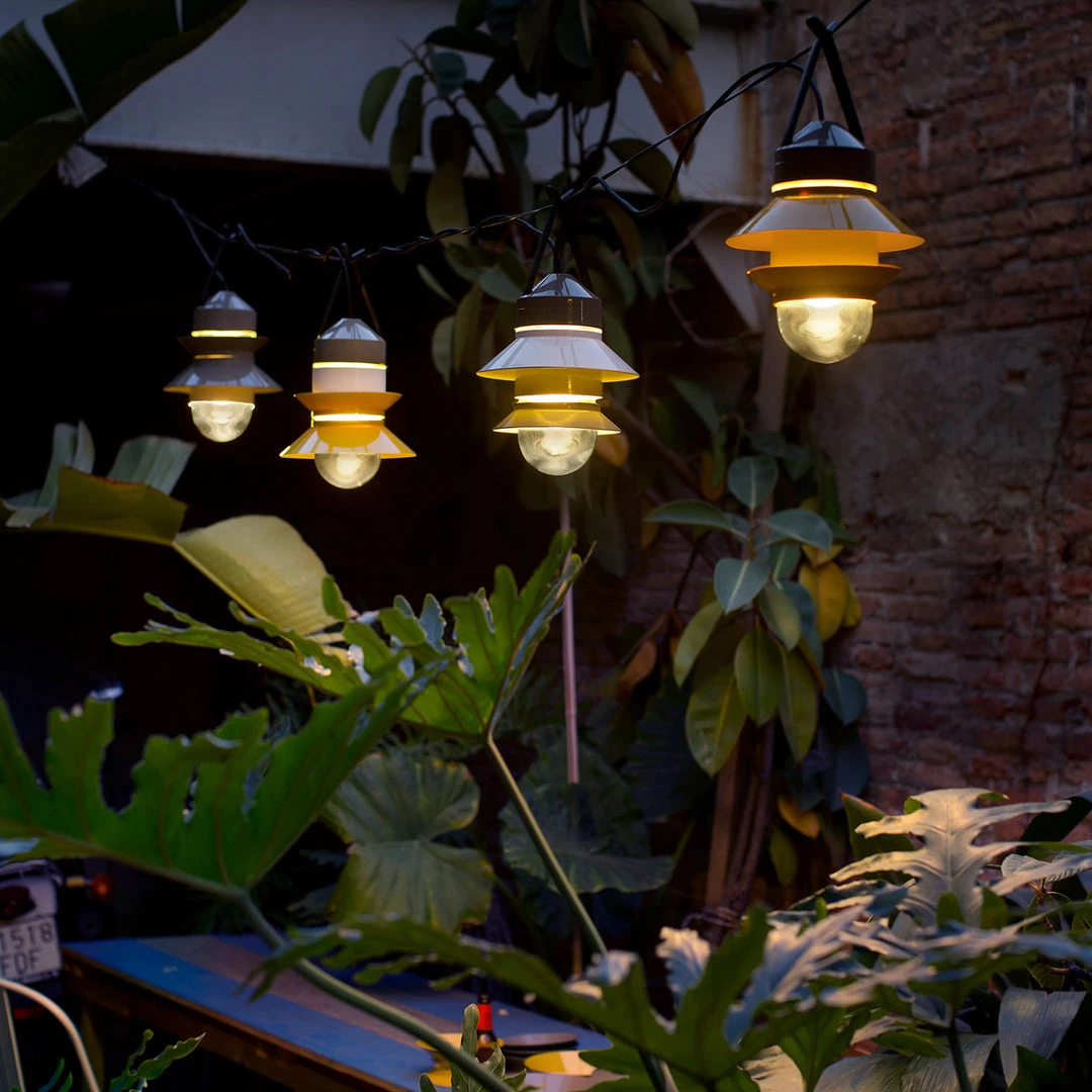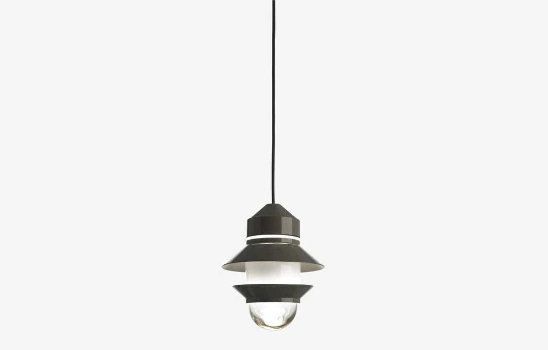 Inspired by the lanterns found on fishing boats, this collection of customizable outdoor lamps allows you to create multiple compositions. Users can choose how many shades to place on the diffuser, along with their order, position and direction. Available with white, grey, or mustard-colored shades, this interplay of combinations yields a rich array of direct or reflected light. The Santorini collection can be hung from the ceiling, either individually or clustered together, or they can be strung up like a garland. They also work as wall lamps or standing lamps using accessories that can easily be added. The Santorini is also available as a fixed-stem wall or ceiling fixture. The metal stem provides rigidity to the light, improving its usability in outdoor applications and lending the fixture a more solid appearance.