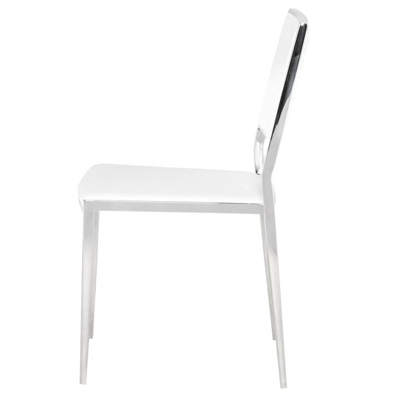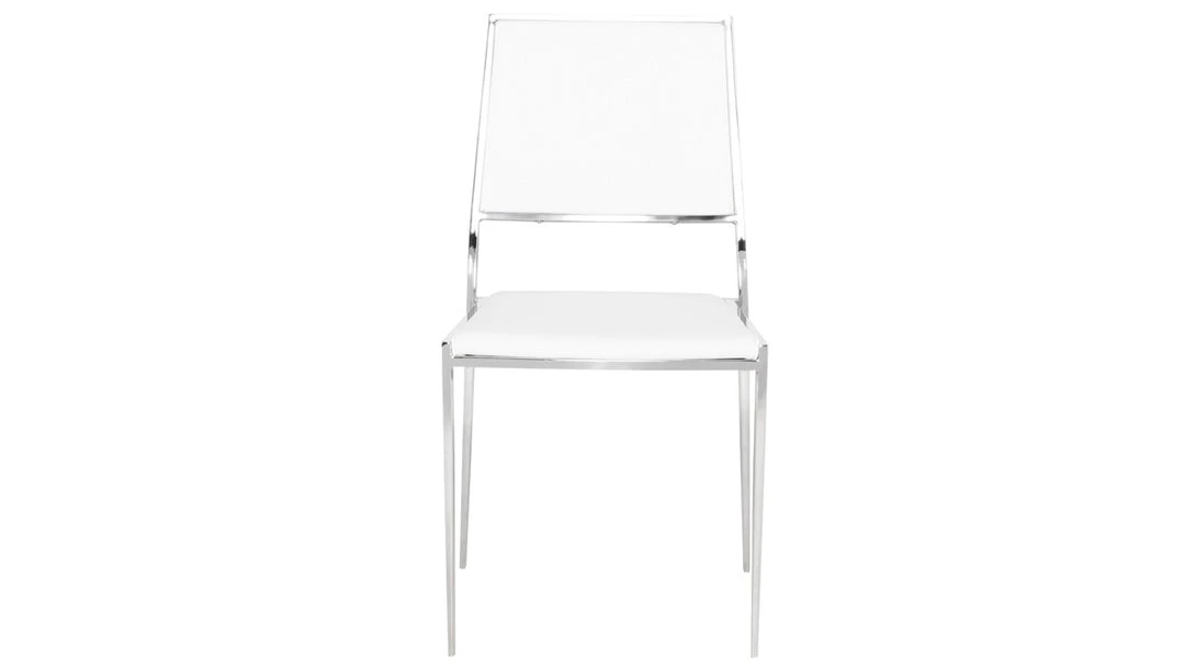 The Aaron dining chair is an alluring combination of stainlessßsteel and Naugahyde. The Aaron dining chair is clean, versatile, contemporary, the geometric frame provides comfort with a streamlined elegance.