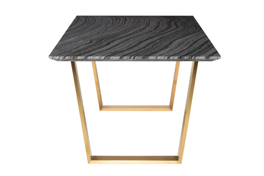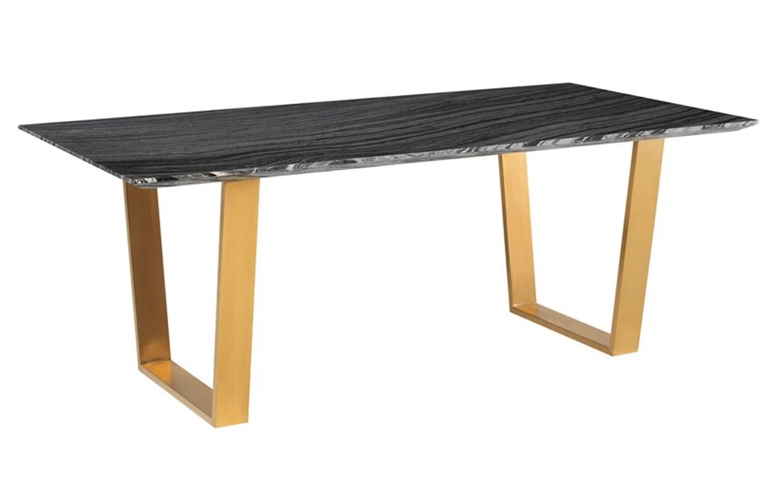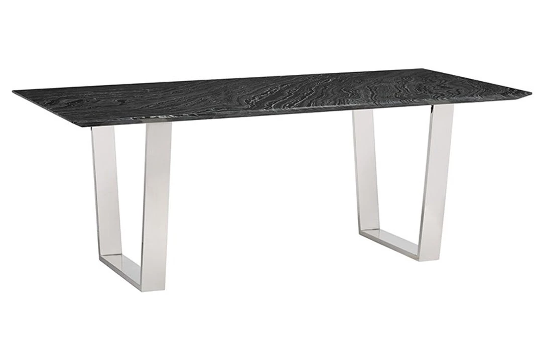 The Catrine Dining Table is a striking example of elegant contemporary design. Bold modern lines define the Catrine pairing a cool textured marble table top with steel legs presenting a sophisticated urban aesthetic. Each piece of marble is expertly crafted out of a unique piece of natural stone, creating beautiful variations and one-of-a-kind details.