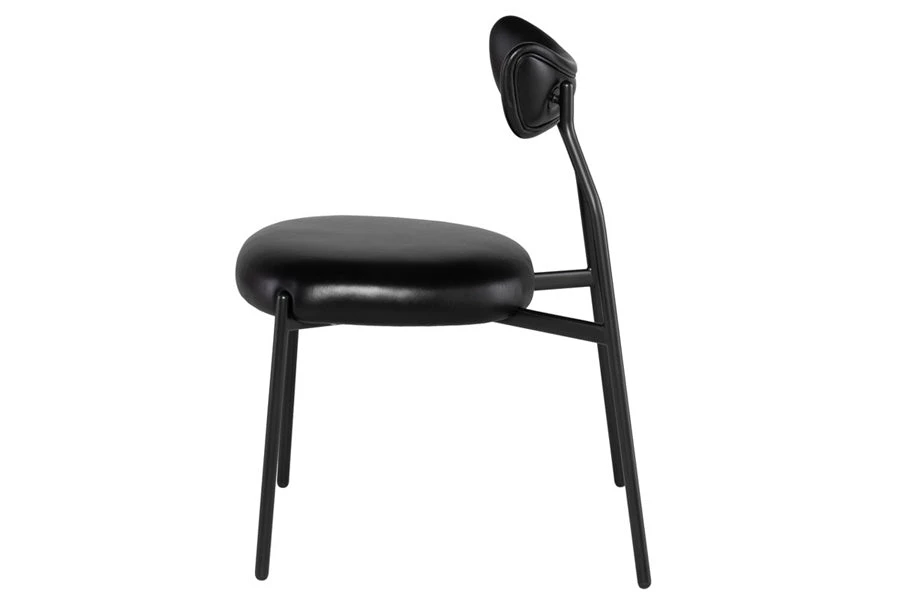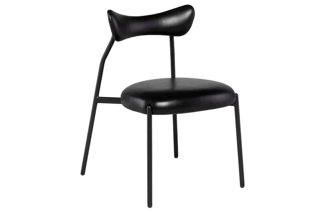 The Dragonfly Dining Chair features a thin and enveloping backrest. Its frame is built with a black steel tube, while the seat comes in either leather or fabric.
