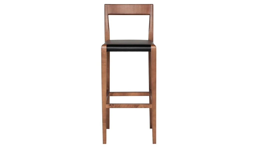 The Ameri bar stool augments a traditional wooden frame with fine, Scandinavian lines, lifting and lightening the entire piece. The black leather upholstered seats simple, comfortable, design complements the pared down aesthetic of the solid birch frame finished in walnut stain.
