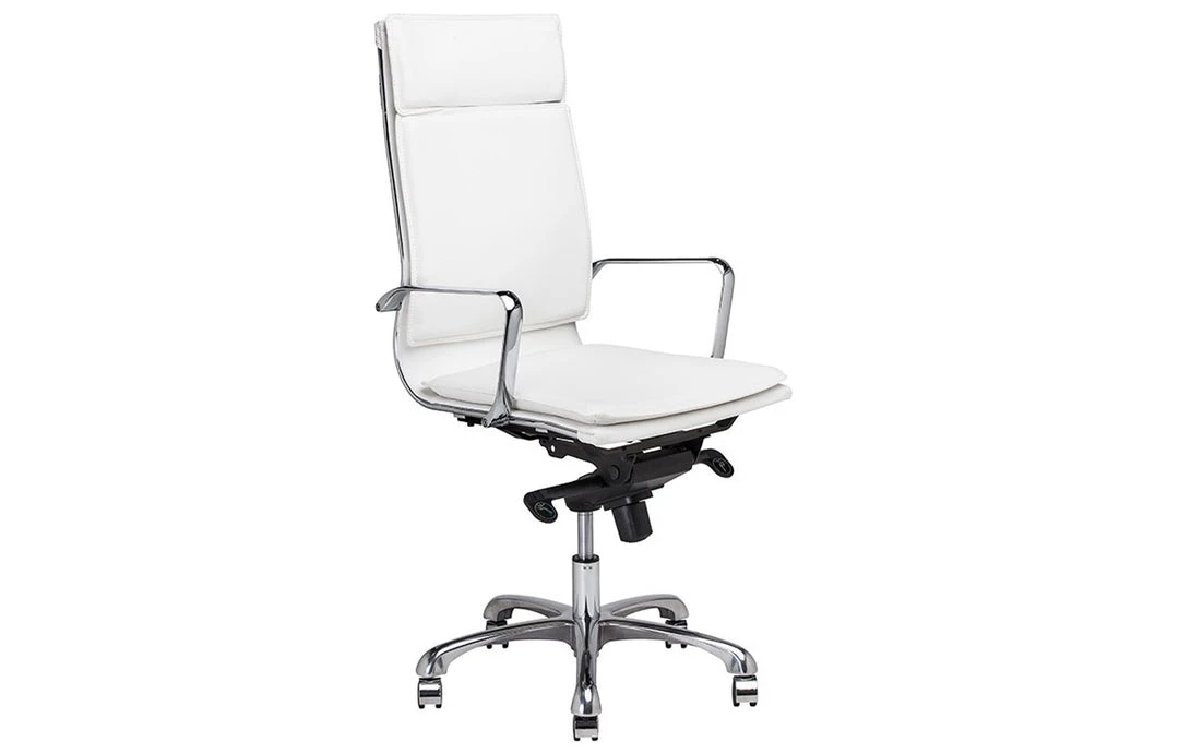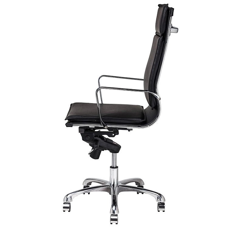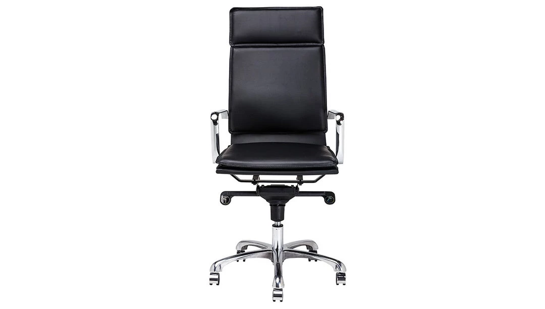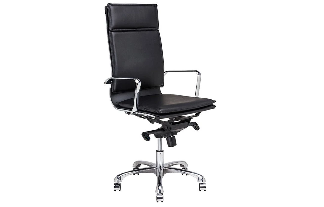 Comfort, versatility and sleek ergonomic design imbues the Carlo high back office chair with its own sense of distinction and style. A contemporary aesthetic, highlighting refined design, the Carlo high back has a double padded, fully adjustable, seat and tall back rest in rich tailored naugahyde for added comfort, with chrome accented arms and 5 star castor base for 360 degree swivel.