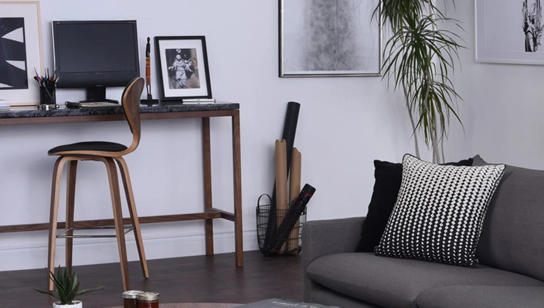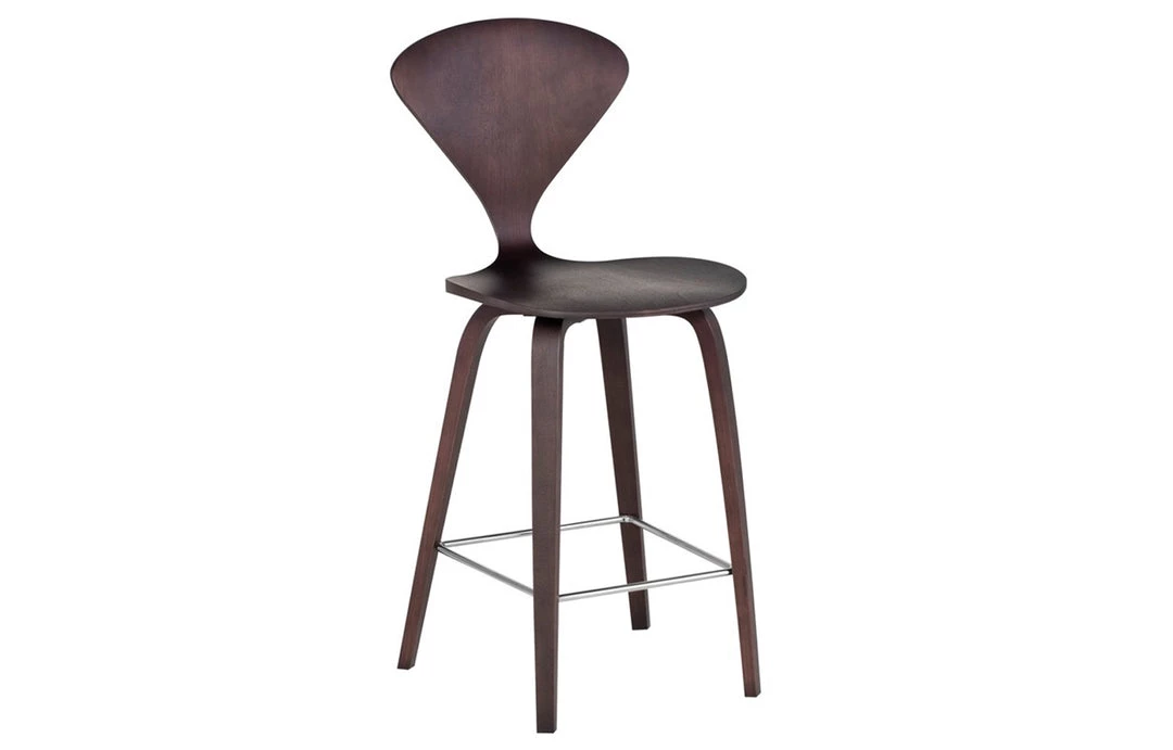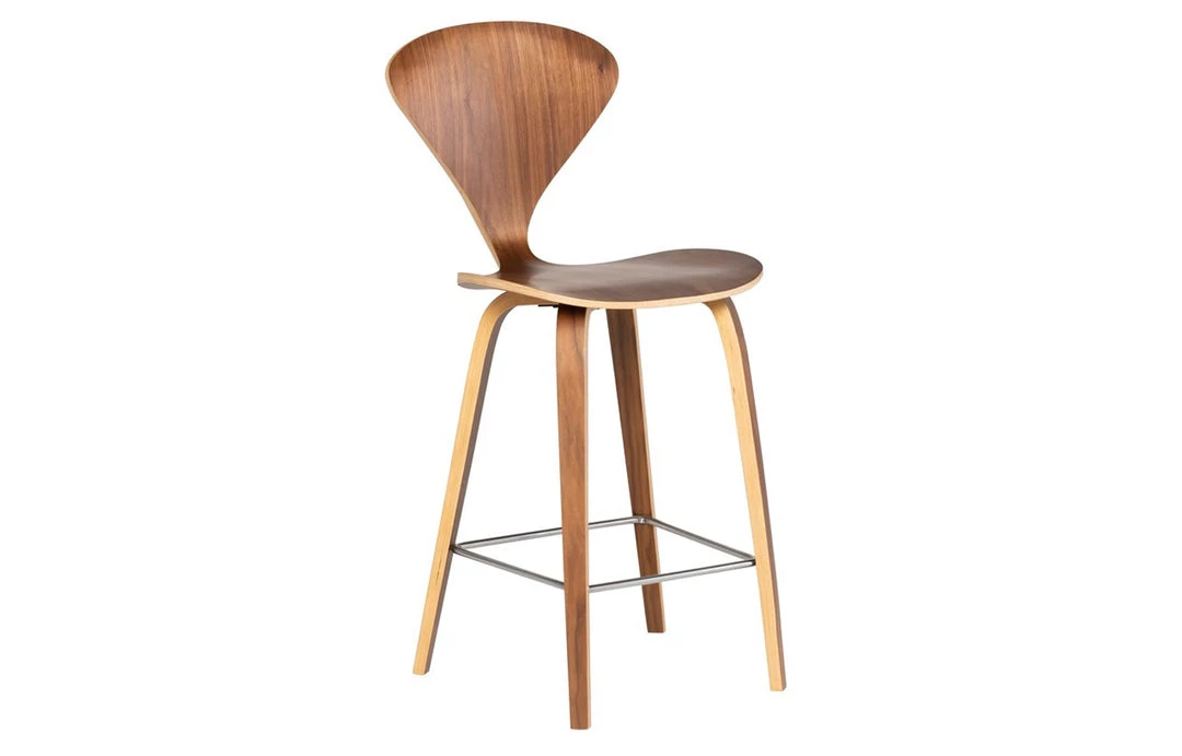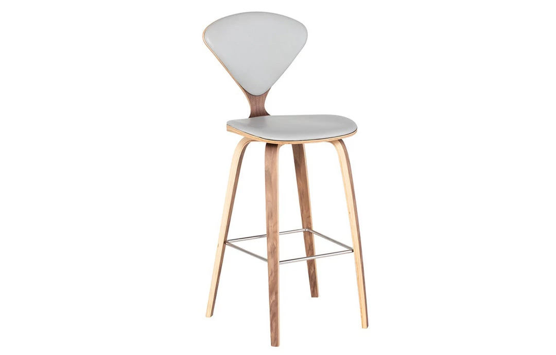 The Satine bar stool is an inspired collaboration of design and craftsmanship. An eye catching design of formed and sculpted plywood with an American walnut veneer. Adding dimension and strength, a stainless steel rod footrest is an elegant feature in high polish stainless steel.