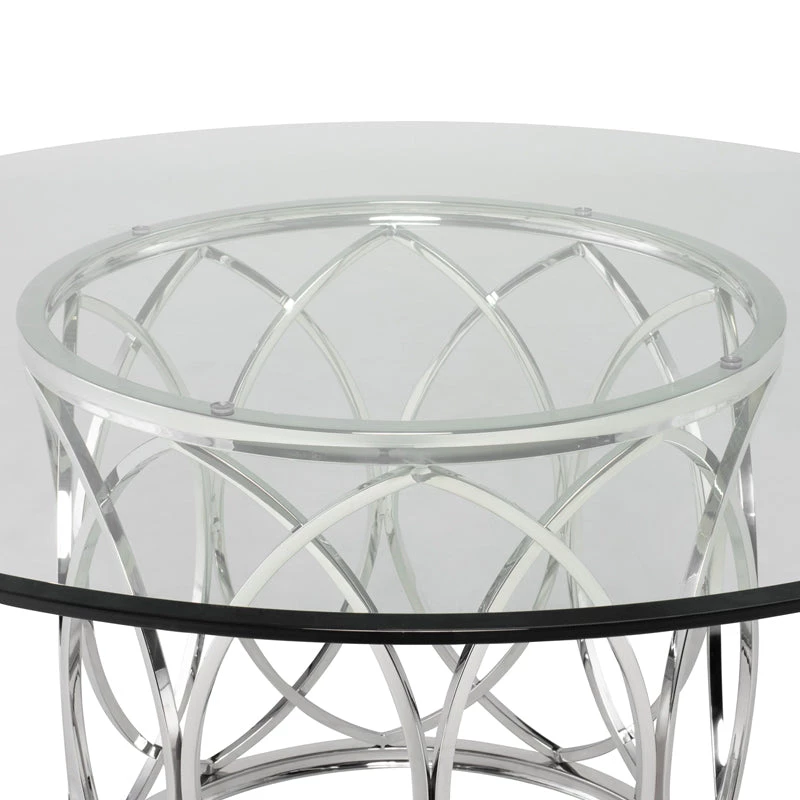 The Juliette Dining Table dazzles in high-polish stainless steel and glass. Characterized by interwoven rings in brilliant silver, the frame defines the Juliette inspiring glamour and occasion.