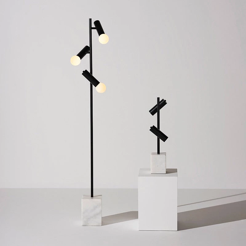 The impeccable modern Dane Floor Light projects a cool composed charisma. A solid marble base is paired with a matte pipe frame supporting adjustable cylinder shades, presenting slim tapered sophistication. Each piece of marble is expertly crafted out of a unique piece of natural stone, creating beautiful variations and one-of-a-kind details.