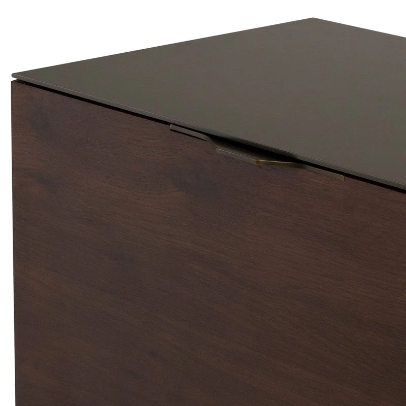 The Drift Storage Collection includes shelves, cabinets and drawers to create a functional wall system that allows to organize home and office. All are made from rustic oak veneer and solid oak, with steel tops and hand-crafted brass drawer pulls.