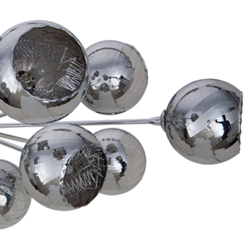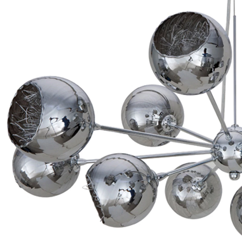 The Sylvie Pendant features a captivating orbital cluster of twelve chromed spherical orbs hand blown and vacuum plated with borosilicate glass. A chromed stainless steel frame canopy and stainless steel suspension cable adds to the elegantly refined contemporary aesthetic.