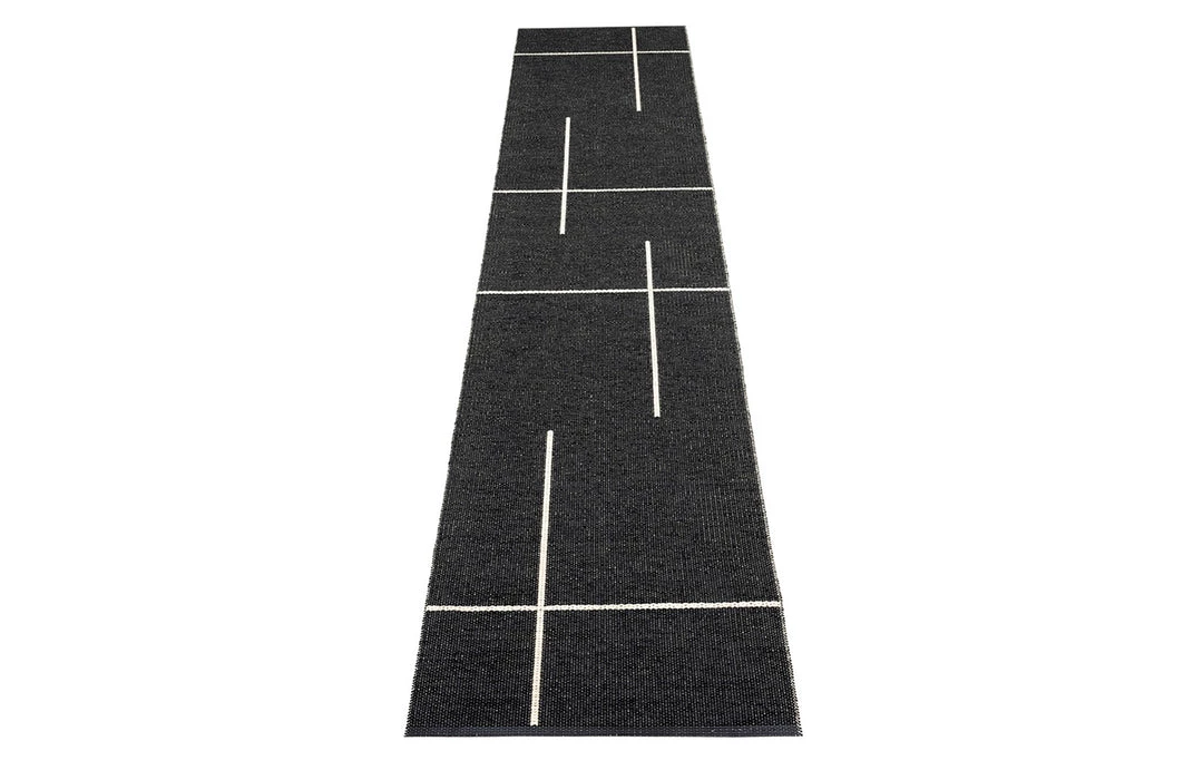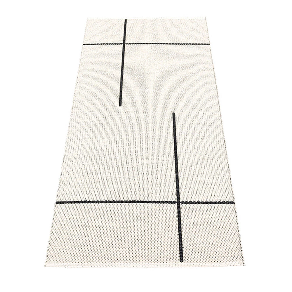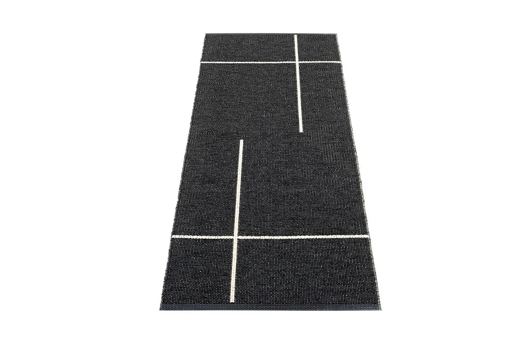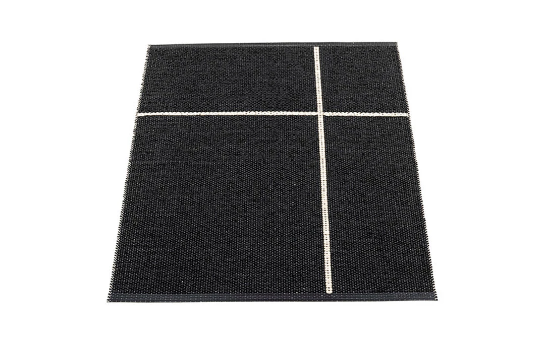 Plastic rug for indoor and outdoor use, made in Sweden. Made of Swedish manufactured, certified phthalate free PVC ribbon, woven on traditional looms using wooden shuttles. Reinforced, welded edges for strength and durability. Very practical and easy-to-care-for, hand or machine wash at low temperature 30°C/85F, no spin.