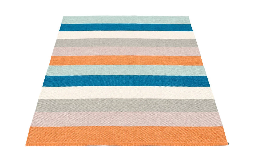 Add color and character to your home with the Molly Petrol Rug. Its multi-color striped pattern matches the style and trend of modern home designs. The durability and sturdiness of the carpet are because of the welded PVC ribbons. Built by skilled craftsmen on traditional looms, the rug offers a lot of warmth and comfort. Wooden shuttles were used in the weaving process. The high-quality plastic and use of polyester warp give this rug an elegant appearance. It has double-hemmed edges with the logo of Pappelina stamped on them.