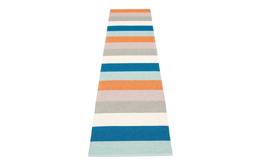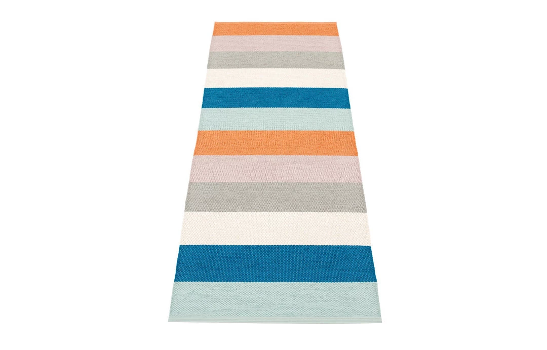 The Molly Petrol Runner Rug comes with a variety of subtle colors. The calm and friendly colors of orange, blue, white and grey fill the strips of this winsome rug. It has been manufactured using plastic and PVC warp to make it long-lasting and resilient. The rug has been designed with the welded ribbon technique and has been embossed with Pappelina logo at both edges. It is available in 4 different sizes to fit into respective spaces. This finely designed rug complements all corners of your beautiful home.