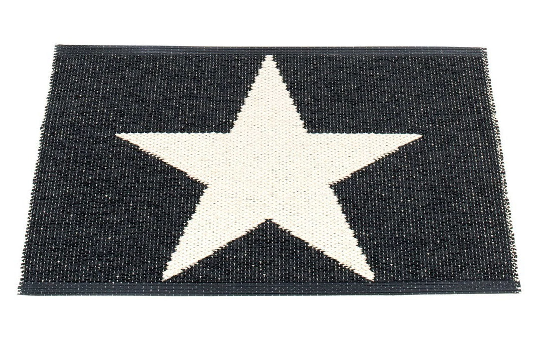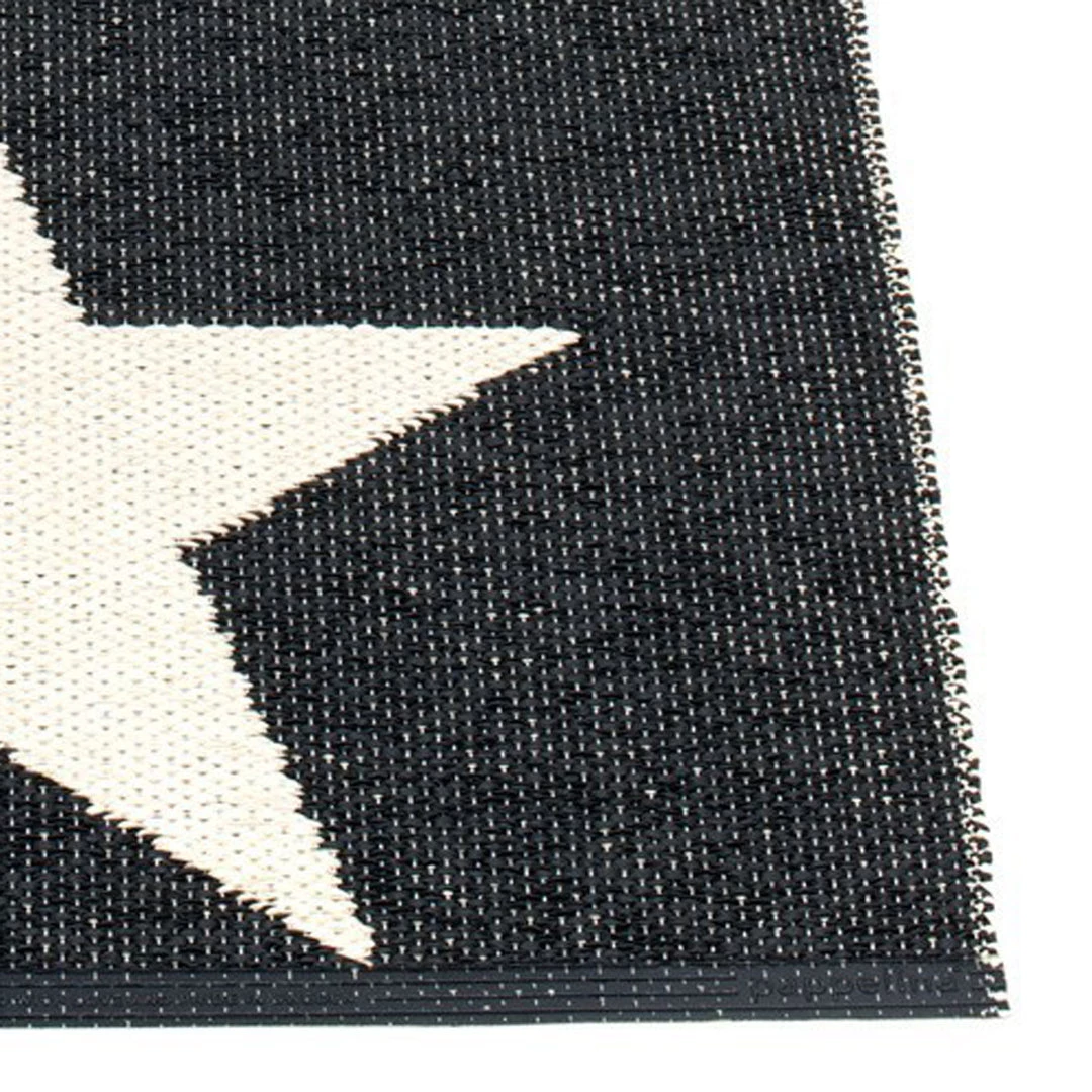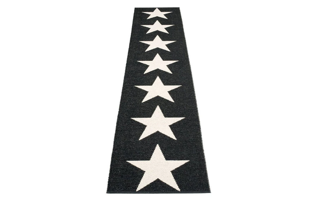 Finely crafted for sheltered gatherings or seasons in the sun, the Viggo One Black & Vanilla Runner Rug instantly transforms any interior or exterior décor into a space of visual inspiration. More than a decorative enhancement, this runner ensures stress-free maintenance. There are four vanilla colored stars on black base that forms the highlight of this runner. Made from ISO 14001 certified PVC-plastic and polyester-warp, this runner is eco-friendly and long-lasting. With a multitude of decorating possibilities, this runner rug extends an open invitation for friends and family to gather.