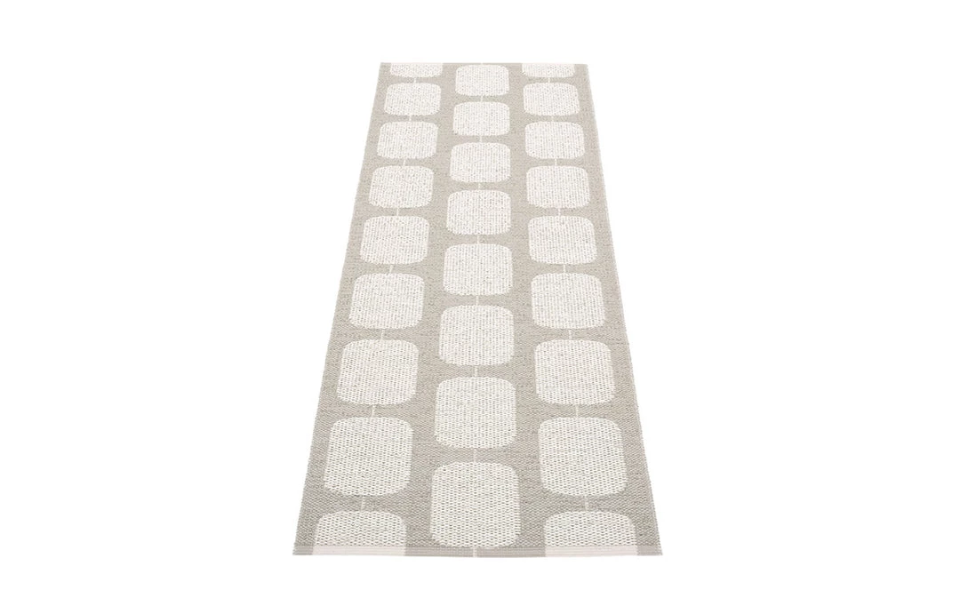 Plastic rug for indoor and outdoor use, made in Sweden. Made of Swedish manufactured, certified phthalate free PVC ribbon, woven on traditional looms using wooden shuttles. Reinforced, welded edges for strength and durability. Very practical and easy-to-care-for, hand or machine wash at low temperature 30°C/85F, no spin.