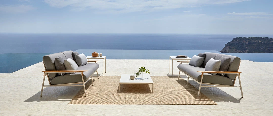 Rectangular coffee table 120 x 70 cm with powder-coated aluminium frame. Aluminium finish in three colours: Cream 34, Metallic Grey 56 or Arena 74. Porcelain or compact top. Porcelain colours: Natural white 81, Light grey 80, Lava grey 82, Corten 83, Black 84. Compact colours: Beige and Black.