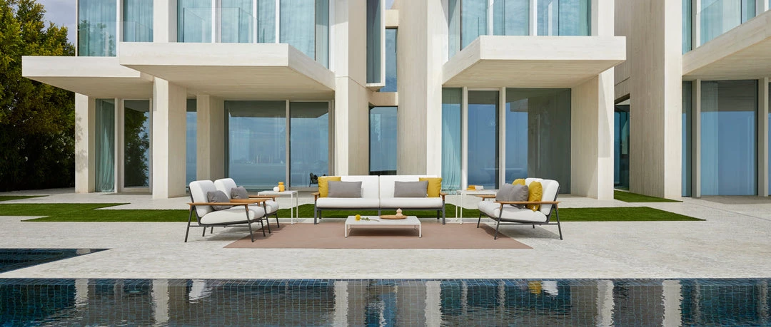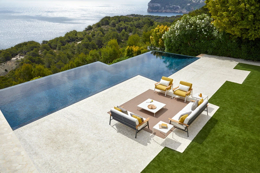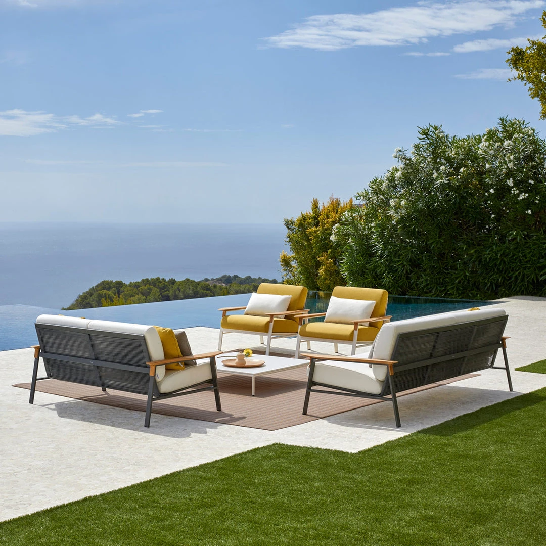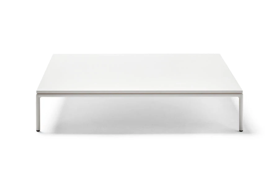 Square coffee table 100 x 100 cm with powder-coated aluminium frame. Aluminium finish in three colours: Cream 34, Metallic Grey 56 or Arena 74. Porcelain or compact top. Porcelain colours: Natural white 81, Light grey 80, Lava grey 82, Corten 83, Black 84. Compact colours: Beige and Black.