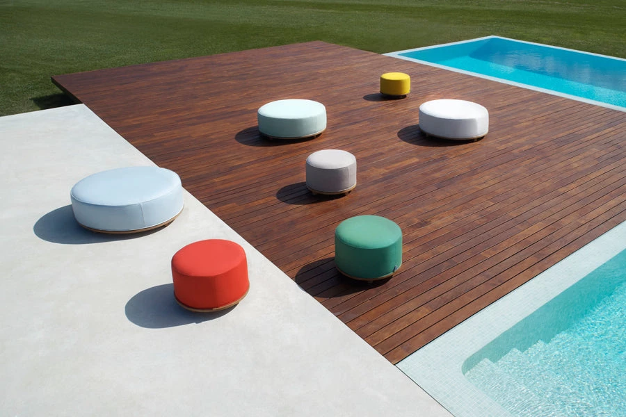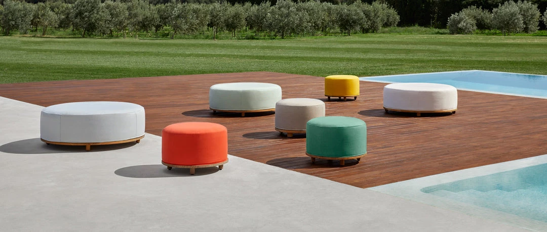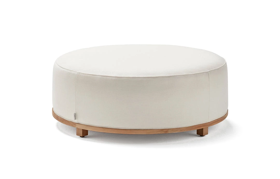 Ottoman composed of round base Ø100 centimetres of grade A teak from sustainable logging forests in Indonesia, 35kg high-strength foam seat cushion lined with waterproof inner cover and outer cover with Point sample fabrics.