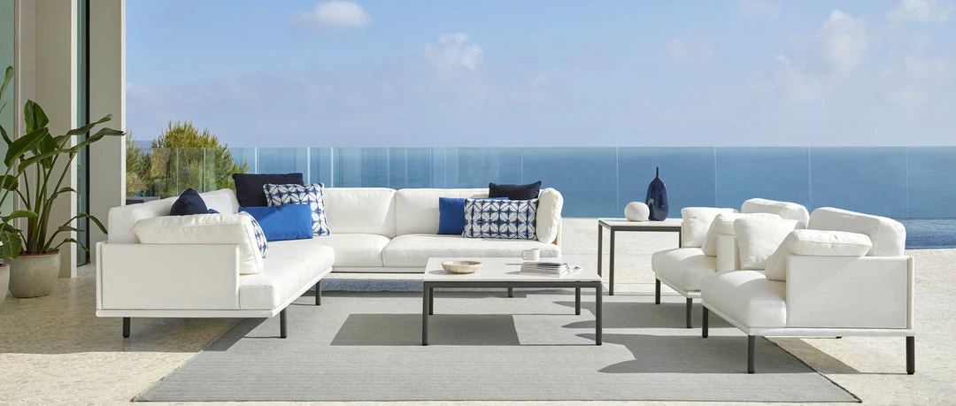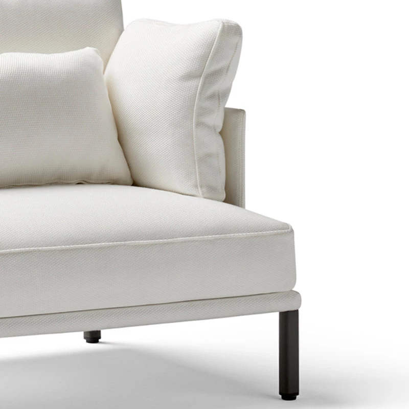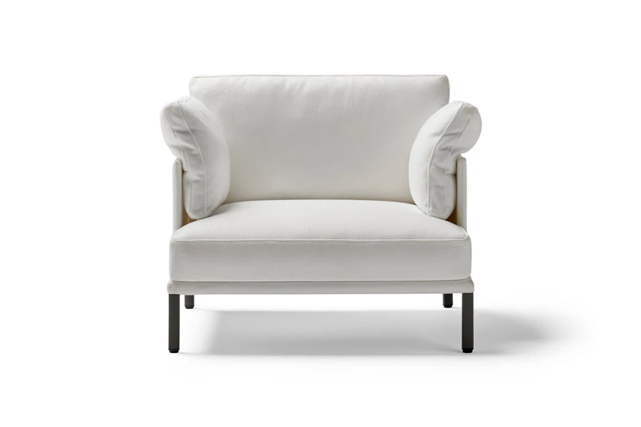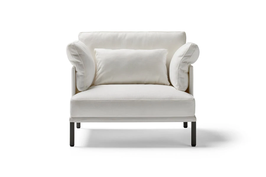 Armchair with powder-coated aluminium frame and adjustable legs. Aluminium finish in one colour: Metallic grey 56. Seat and back cushion in high resistance 35 kg polyurethane foam. The seat cushions include the GOODSIDE slatted suspension method, which is combined with foam to make the seat highly resistant and comfortable. The cushions with this system always include a waterproof cover. The fabric for the cushion covers can be chosen from the fabrics option when configuring the product on the website. You can also buy the cushions without fabric or with your own fabric.