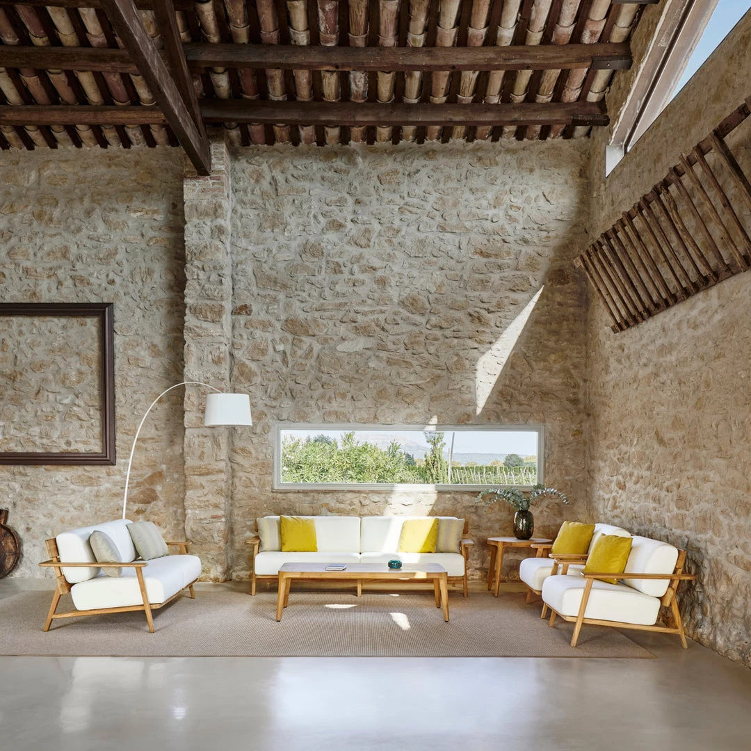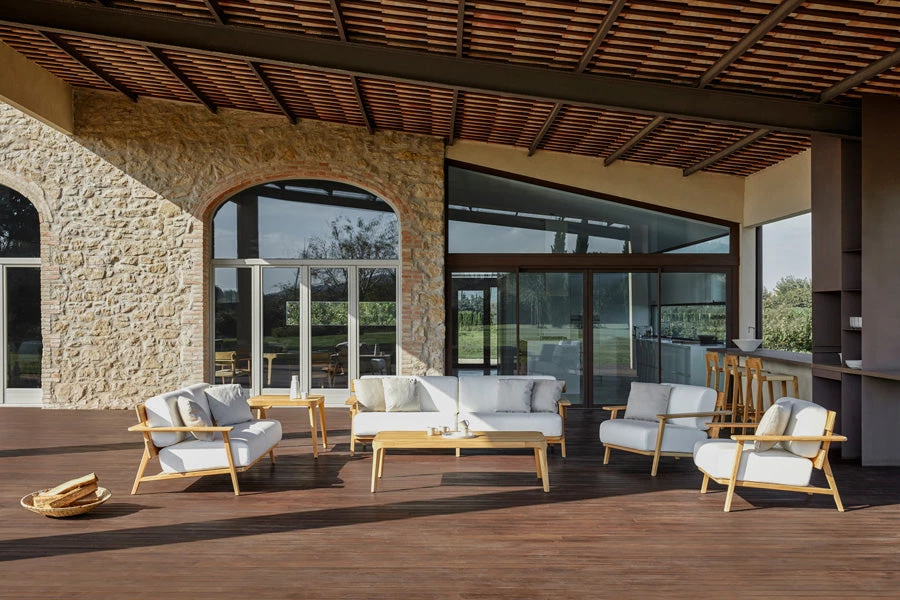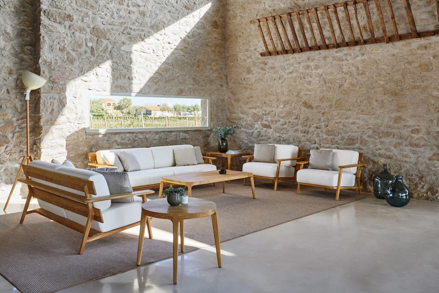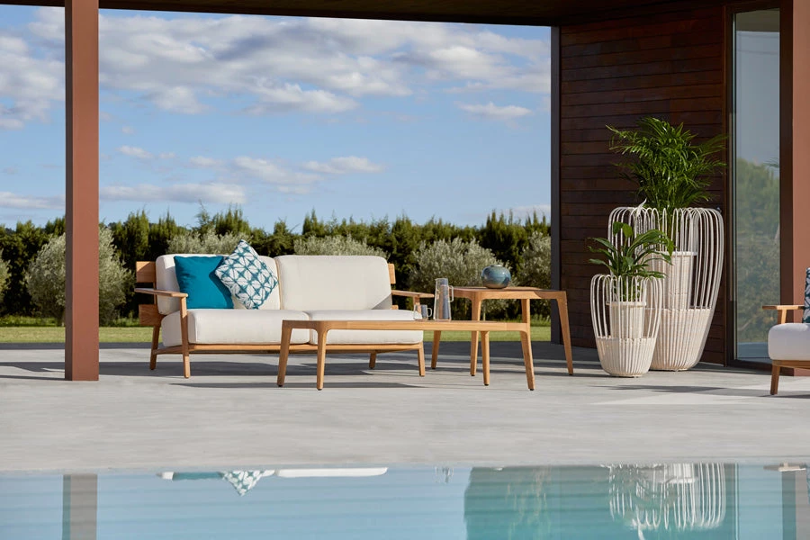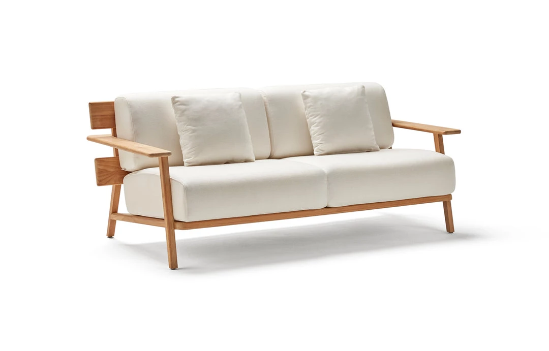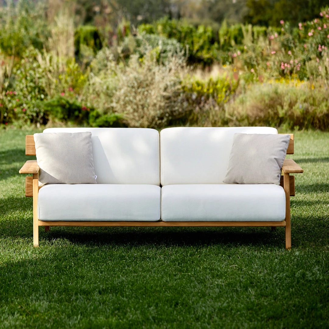 Sofa 2. Frame in grade A teak from sustainable logging forests in Indonesia. Cushions in high-strength 35 kg polyurethane foam with cover in Point sample fabric.