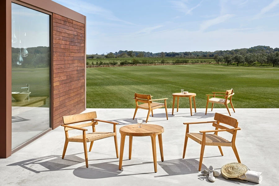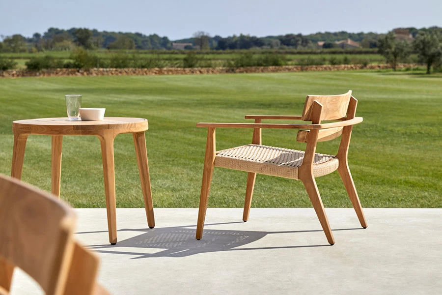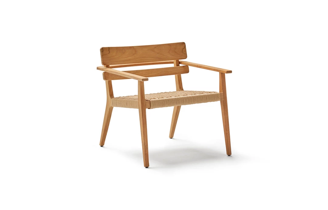 Small lounge chair. Frame in grade A teak from sustainable logging forests in Indonesia. Seat braided in synthetic rope. Optional seat cushion in high-strength 35 kg polyurethane foam with cover in Point sample fabric.