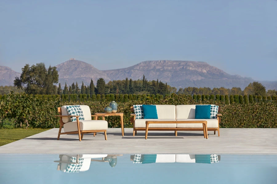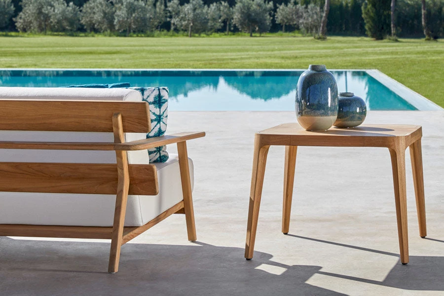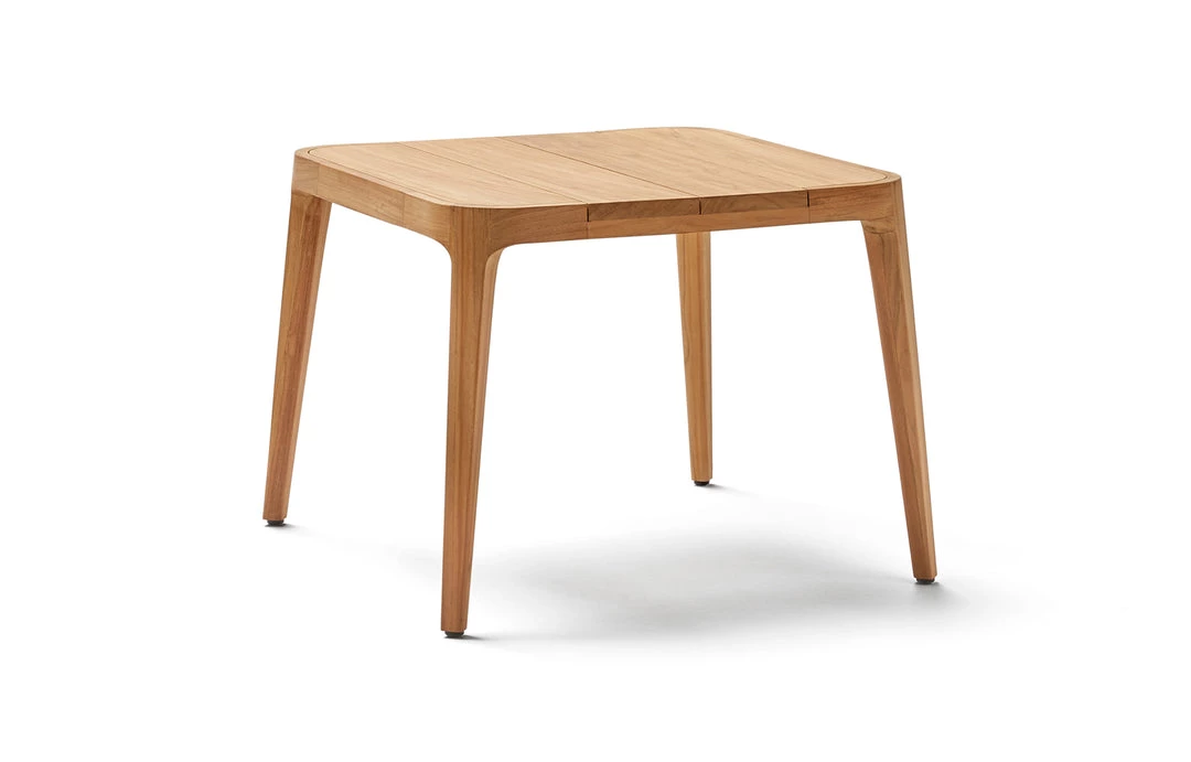 Square side table. Frame and top in grade A teak from sustainable logging forests in Indonesia. Adjustable legs.