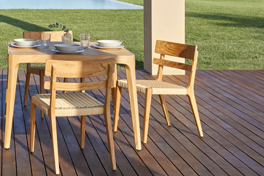 Dining table 100 x 100 centimetres. Frame and top in grade A teak from sustainable logging forests in Indonesia. Adjustable legs.