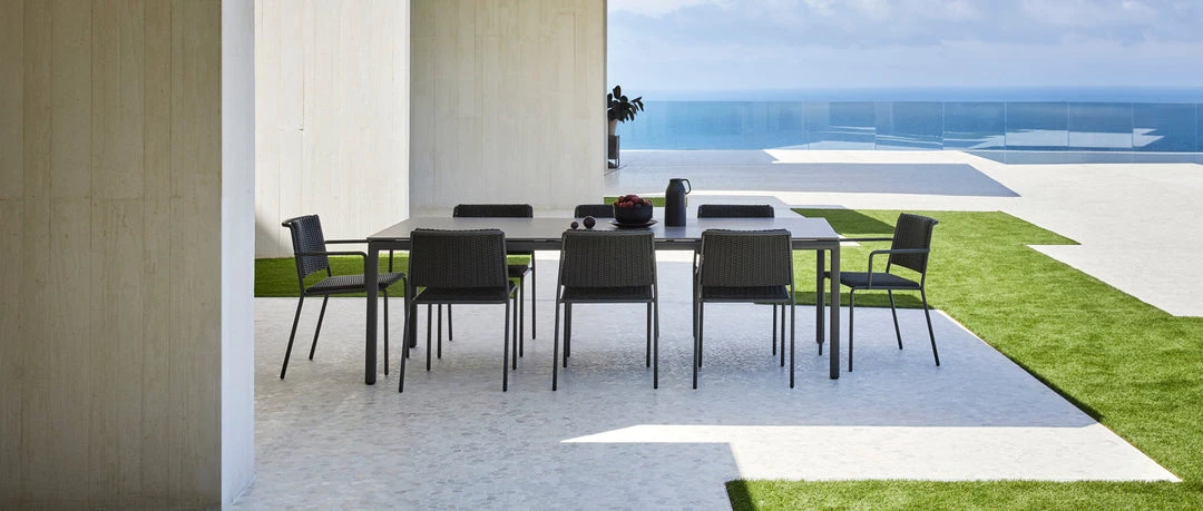 Rectangular dining table 180 x 100 cm and 240 x 100 cm with powder-coated aluminium frame and adjustable legs. Aluminium finish in two colours: Cream 34 or Metallic Grey 56. Porcelain or compact top. Porcelain colours: Natural white 81, Light grey 80, Lava grey 82, Corten 83, Black 84. Compact colours: Beige and Black.