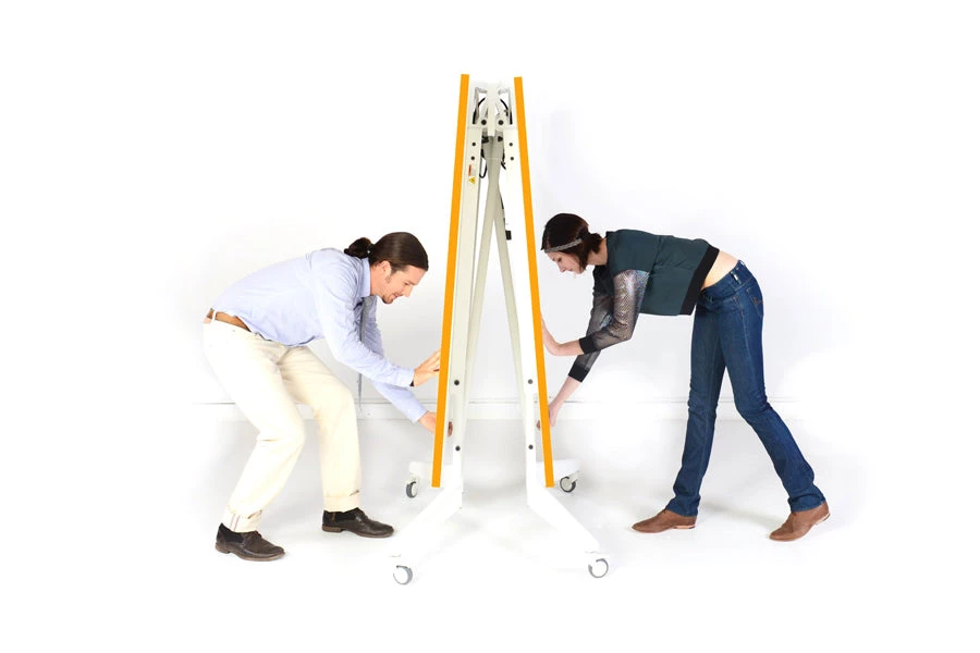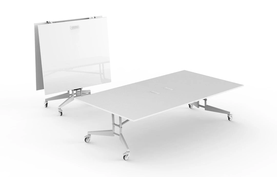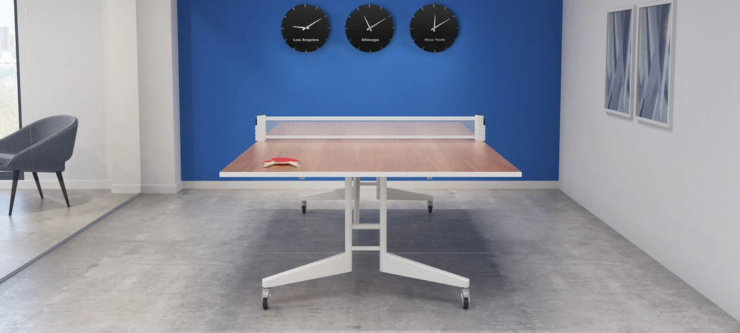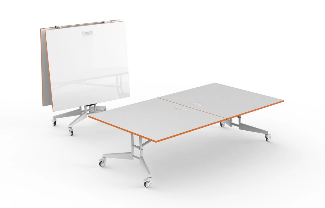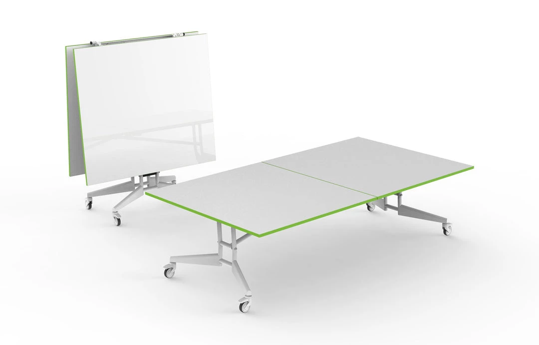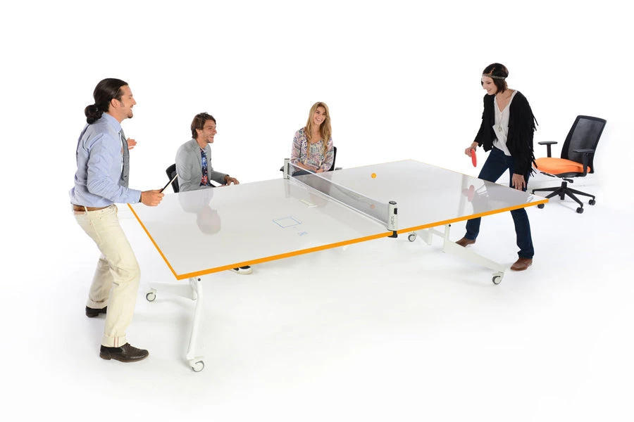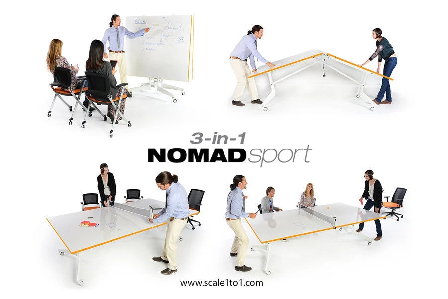 NOMAD Sport Is a Conference Table, Ping Pong Table, and when folded, becomes a Mobile Marker Board, provided the table is ordered with a glossy dry erase surface. Starting with solid construction, the NOMAD Sport Conference Table is a 3-in-1 product. Heavy Duty Casters allows the NOMAD Conference table to fold and roll away, so if your conference room has to double as a yoga studio, it’s no problem to move it at a moments’ notice. If you’re intrigued, there are two more amazing features that’ll blow your mind: 1) The surface material is writeable dry-erase, so it’s also a whiteboard! And 2) It’s a regulation size Ping-Pong table that ships with the Ping Pong Kit for the fun activity! NOMAD Folding Table is 3 times Best Product Design Award-Winning furniture.