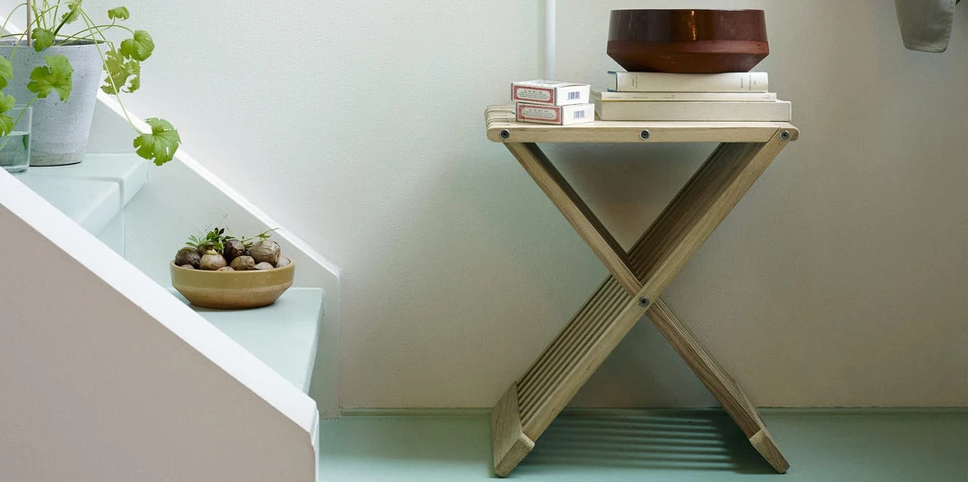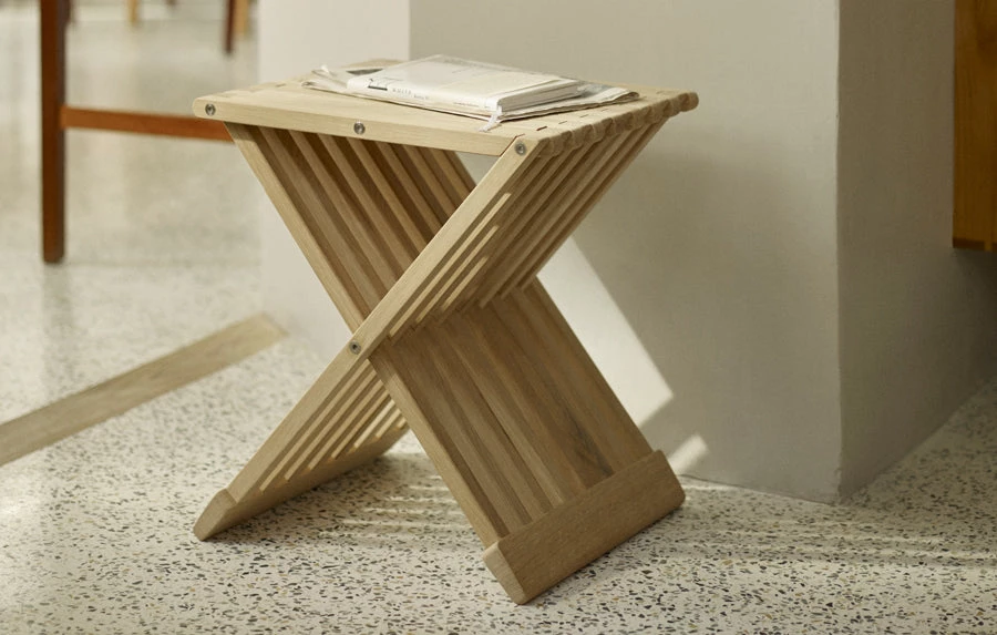 The Fionia Stool is an expression of brilliant design and workmanship. The stool is elegant even when folded. It can be used in every room of the home, as a footstool, side table, bedside table or as a stand for flowers.