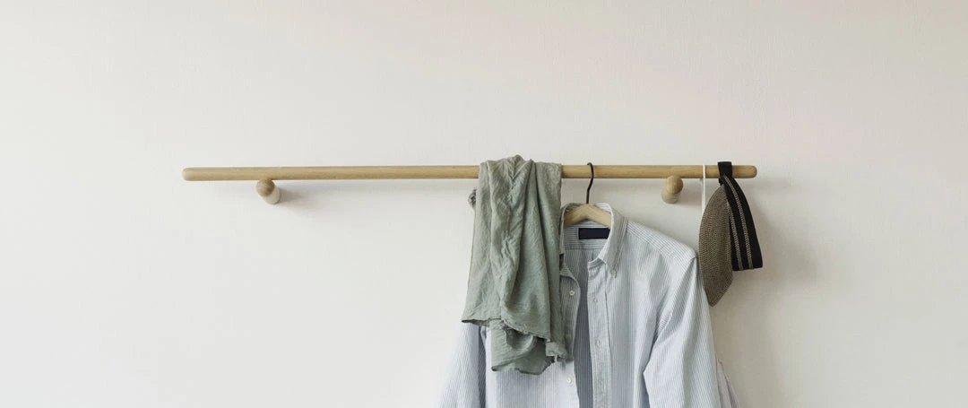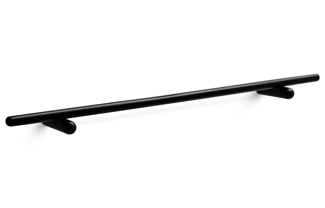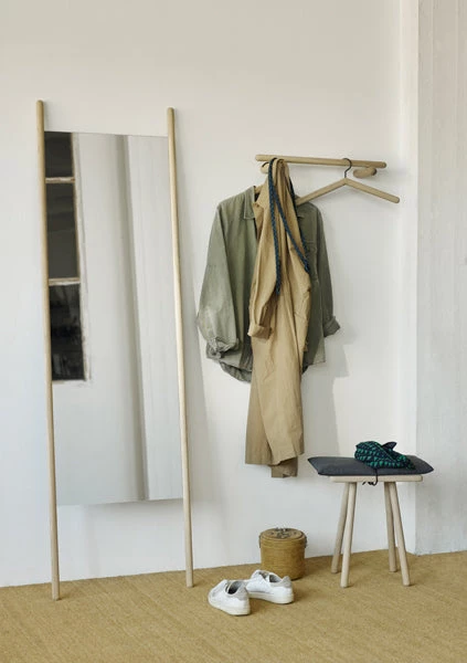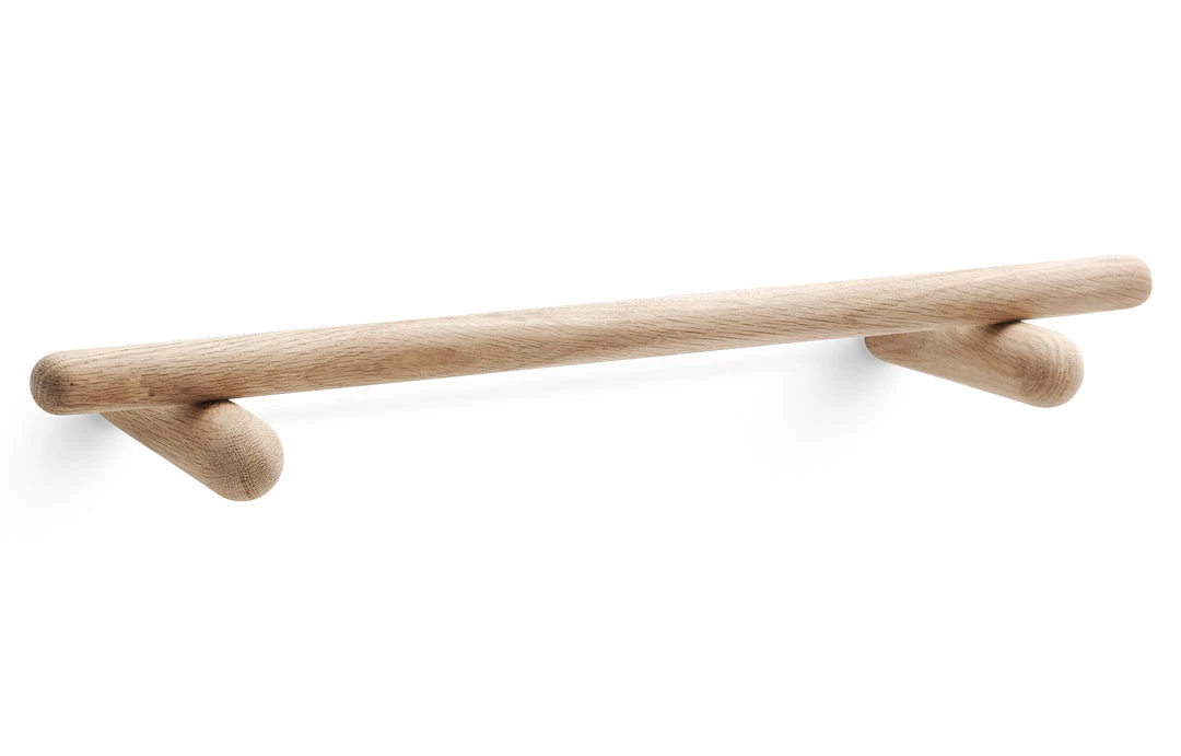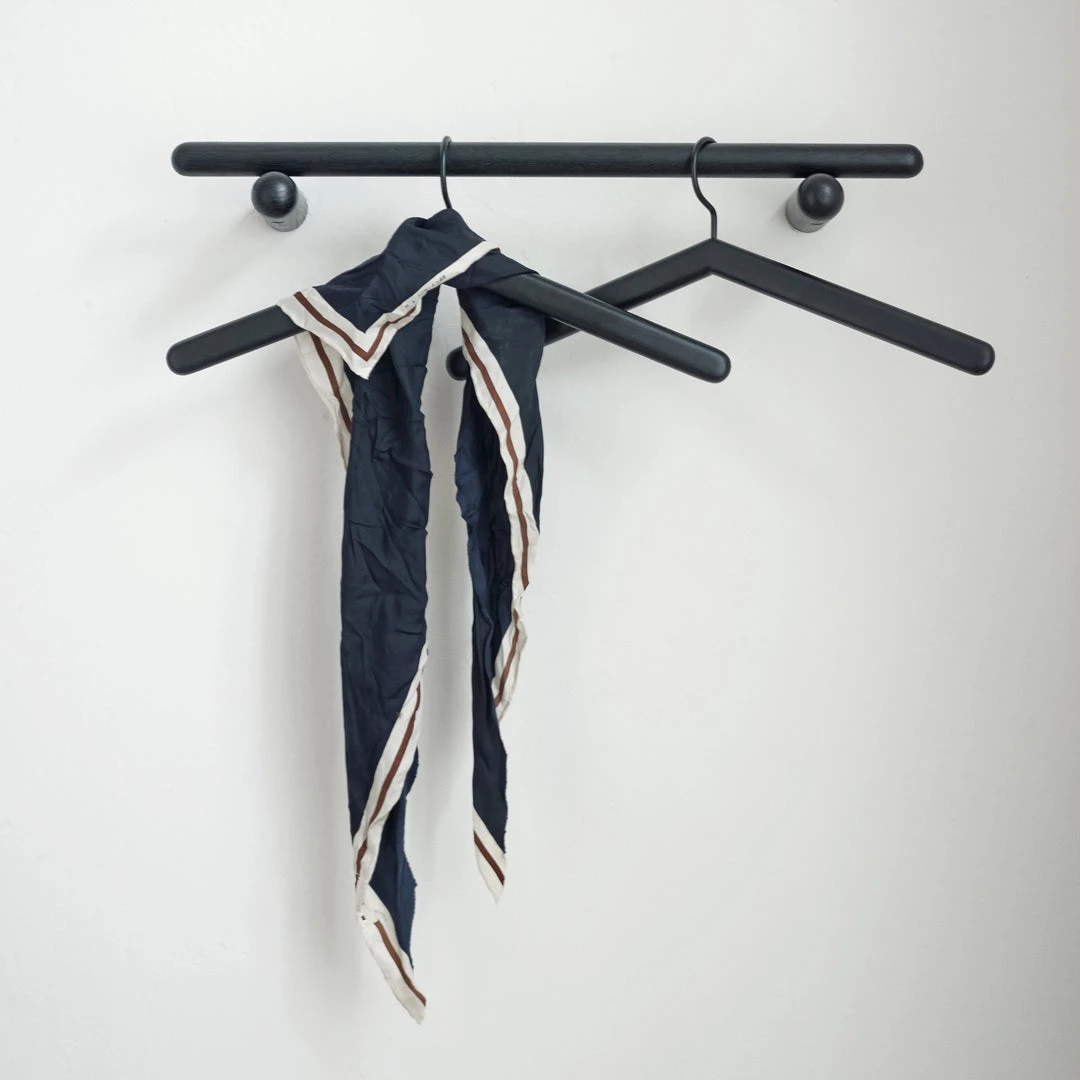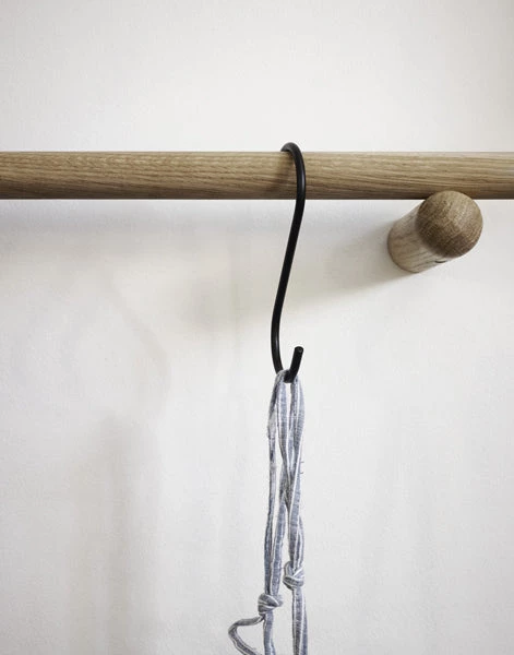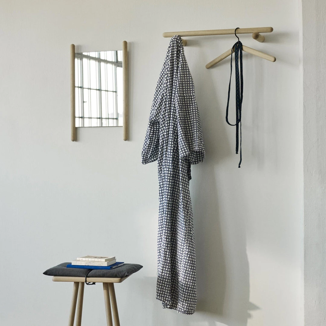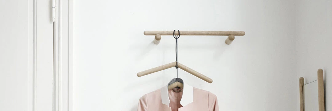 Wooden poles form the basic DNA in Chris L. Halstrøm’s Georg collection. Here, in a set-up reminiscent of a curtain rod, the pole serves as a coat rack. In materials and design, the accompanying hangers with leather straps reinterpret the genre.