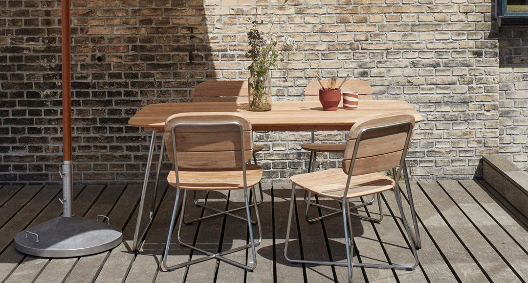 Rustic and elegant. Sturdy and lightweight. Curious and inviting. Like the rest of the series, the Lilium chair is a modern and informal piece of furniture that is suitable for most people and settings. The chair is slightly wider than a traditional dining chair, but outdoor furniture has to have to more weight and power to withstand varying weather conditions. The X-shaped frame leaves open spaces that allow the backrest and seat to give gently when you sit down.