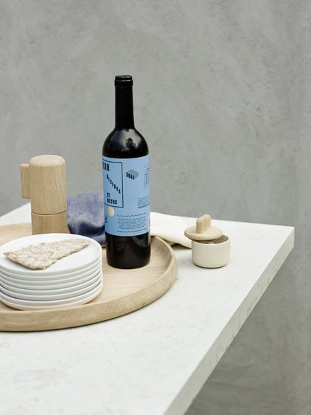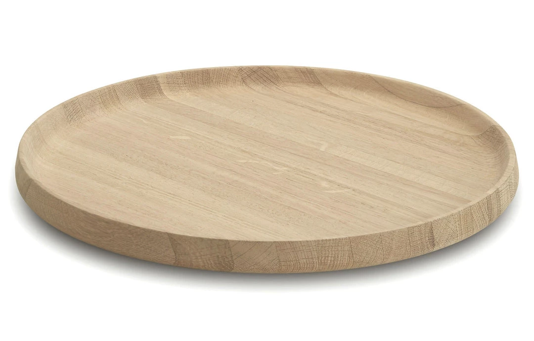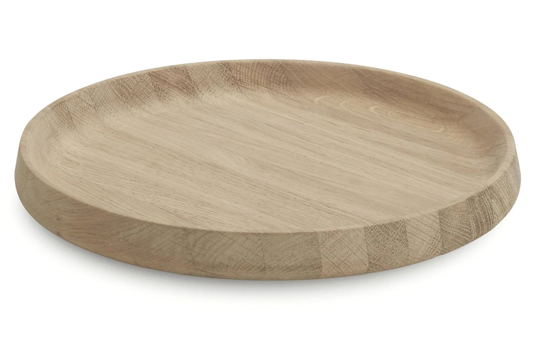 Nordic Tray Ø30 is the small version & Ø45 is the large version of VE2s tray in oak. The wood is characterized by its closed structure and this makes the tray both strong and resilient. The Nordic tray’s circular shape and high edges can contain bowls and dishes, and invites to serving fresh fruit, cheese and charcuterie or other types of appetizers. Small rubber feet are placed under the tray, which gives it a floating expression and makes it easy to lift up from the table again.