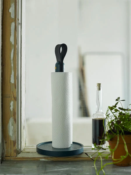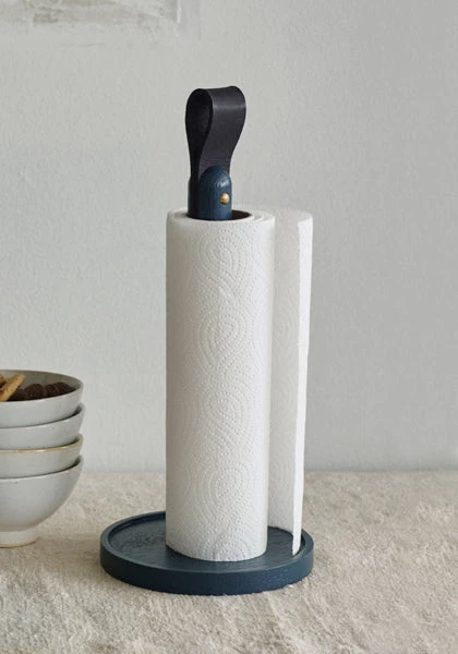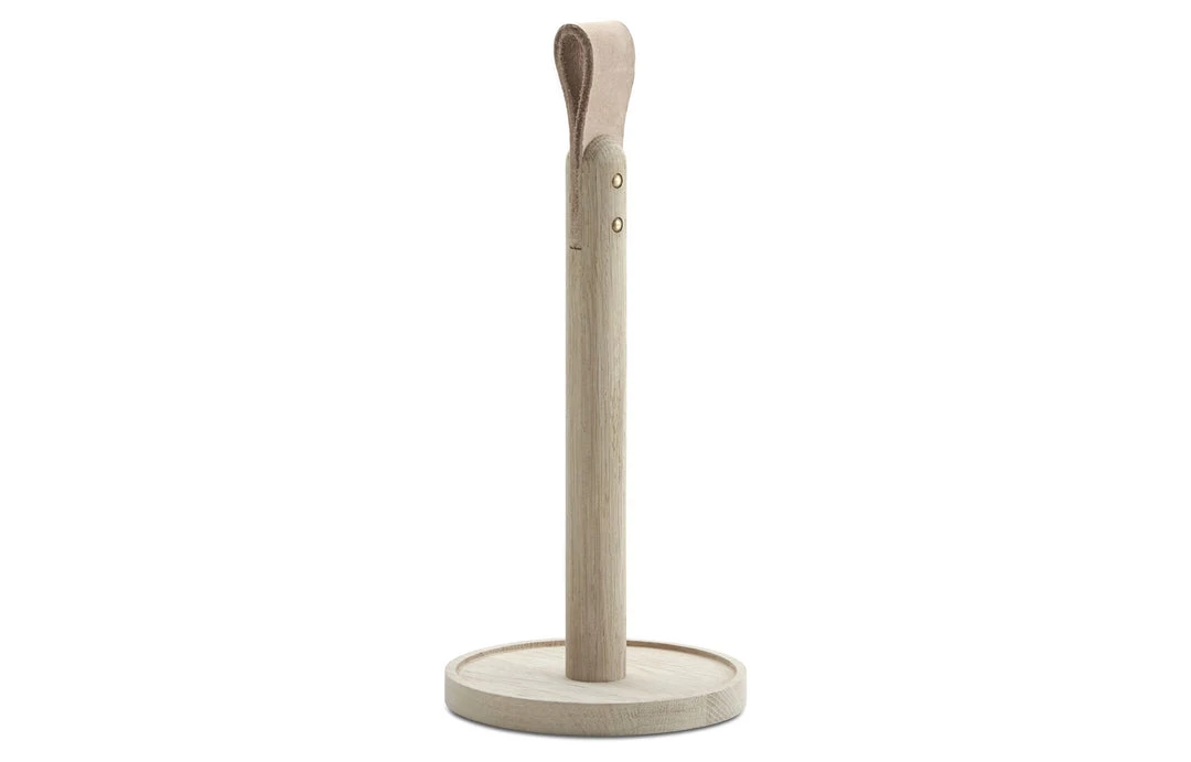 Norr paper towel holder in wood, leather and metal studs has a Nordic design expression. The edge at the base keeps the paper from unraveling, and the leather strap is both charming and practical, making it easy to move the holder.