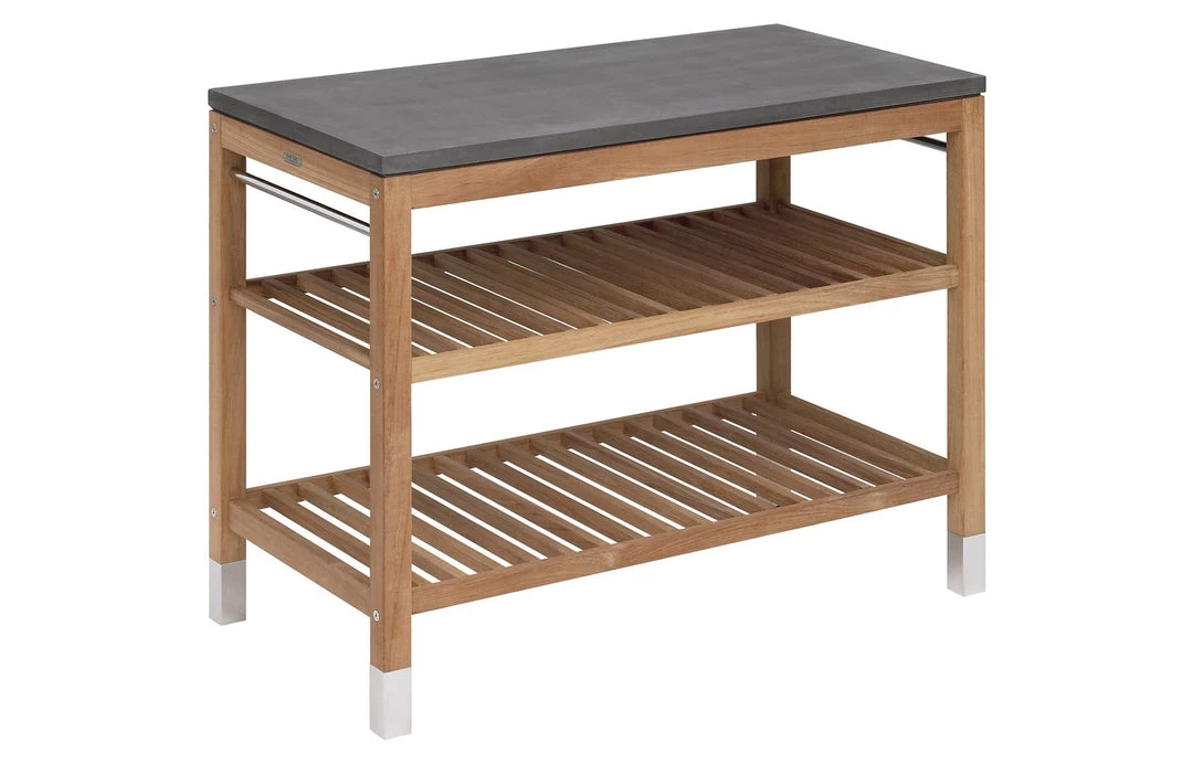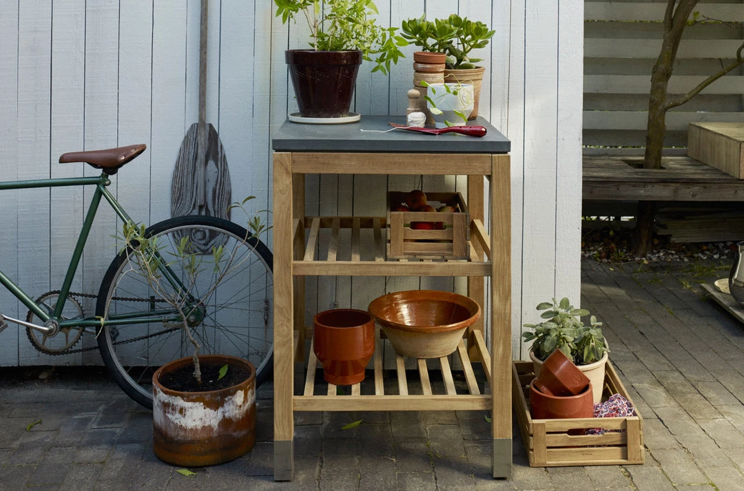 Pantry Module is a versatile work station designed to help out right next to your grill our greenhouse or inside your kitchen. With its two shelves and practical steel tubes on both sides, Pantry offers an exceptional storage opportunity with plenty of space for both kitchen utensils, crafting tools or pots and soil. The table top itself is made from hard-wearing fiber-reinforced concrete while the frame is crafted in teak wood.