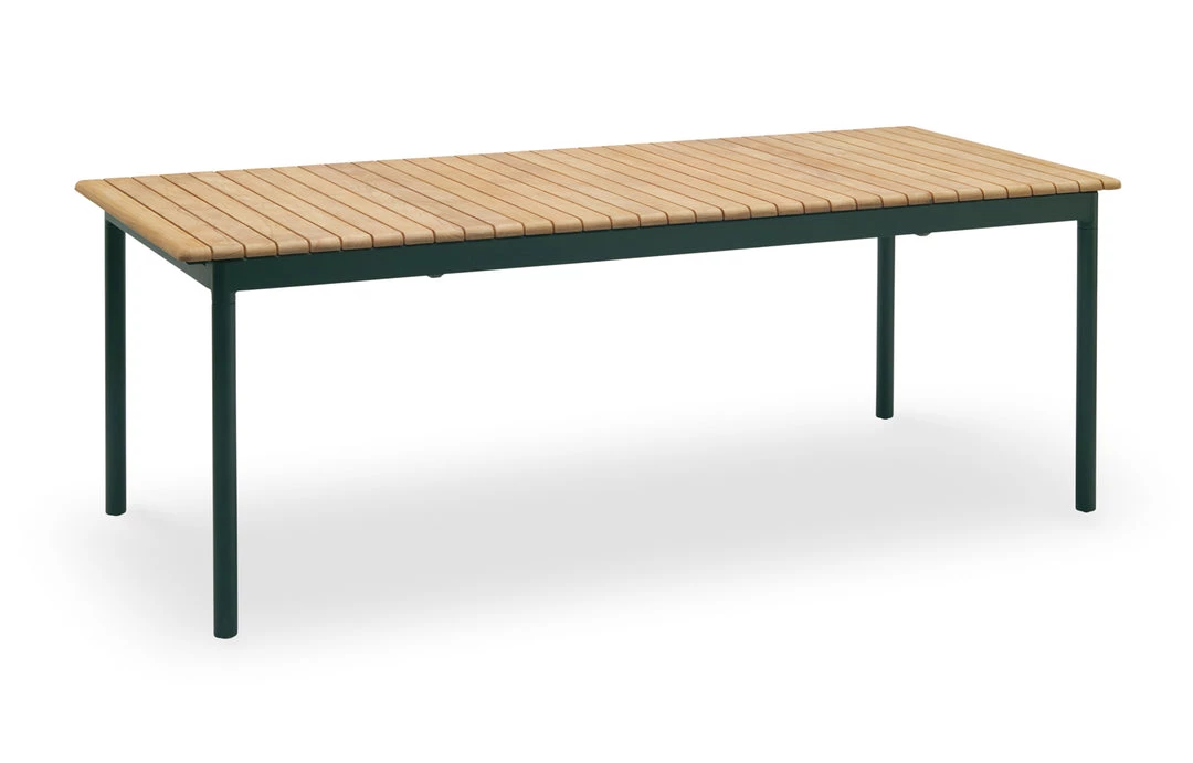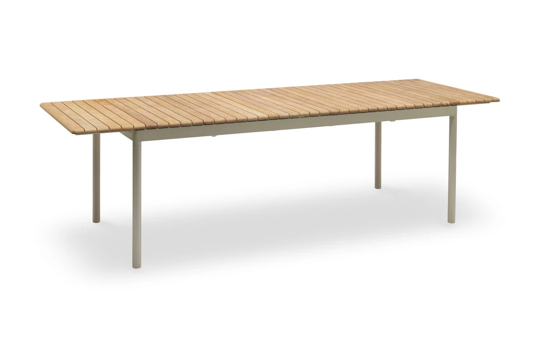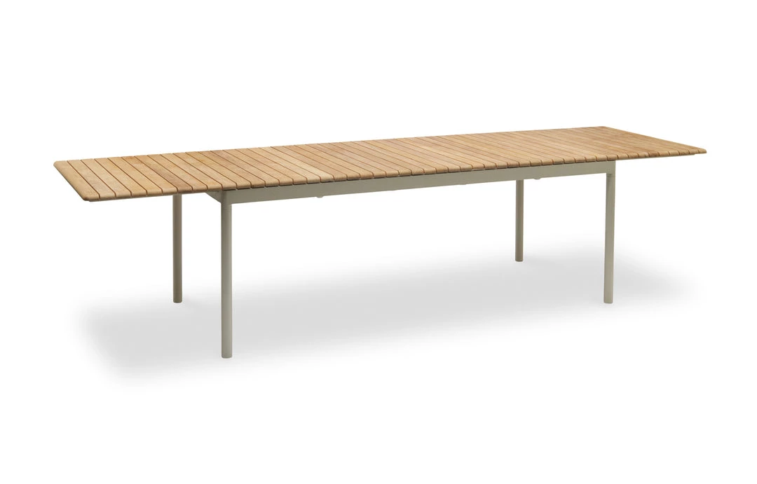 The Pelago table is created for sociability and comfort, easily extended should friends arrive unexpectedly and with a graceful contemporary expression. Part of the Pelago collection, the Pelago table is designed to look as good extended as it does in its closed format. The teak tabletop has rounded edges where it meets the powder-coated aluminum frame and the extension plates match the slatted top. Comfortably seating 6 or 8 people, it can be extended for up to 4 more, with the addition of one or two extension plates. When not in use the extension plates can be stored underneath.