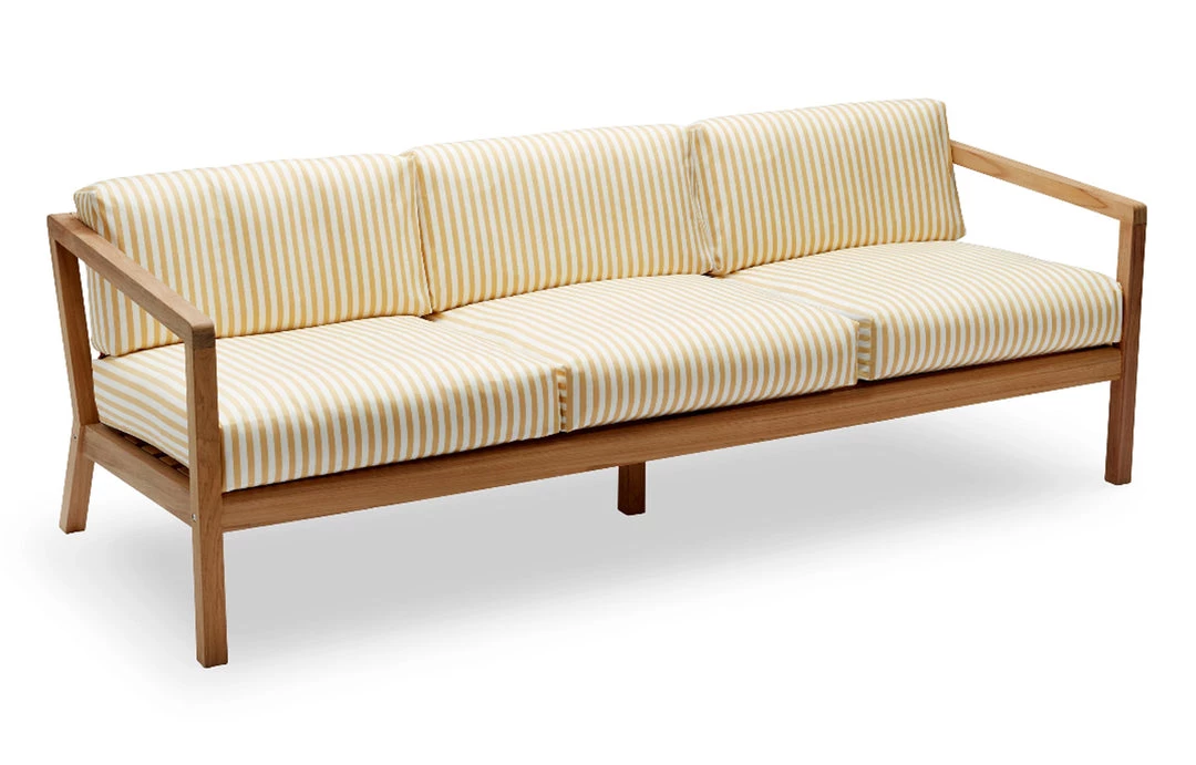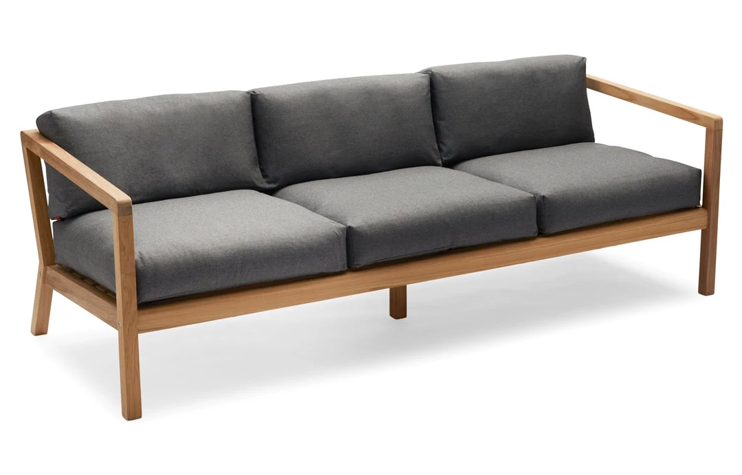 Virkelyst 3-seater is a modern outdoor sofa with the seating comfort of an indoor furniture. The simple wooden frame strikes a contrast with the thick, soft cushions. The upholstery fabrics are Oeko-Tex certified and extremely color and light-fast as well as water and dirt-repellent and even mildew-resistant. The cushion is filled with airy fossflakes – an allergy-friendly polyethylene material which maintains its volume and shape over time.