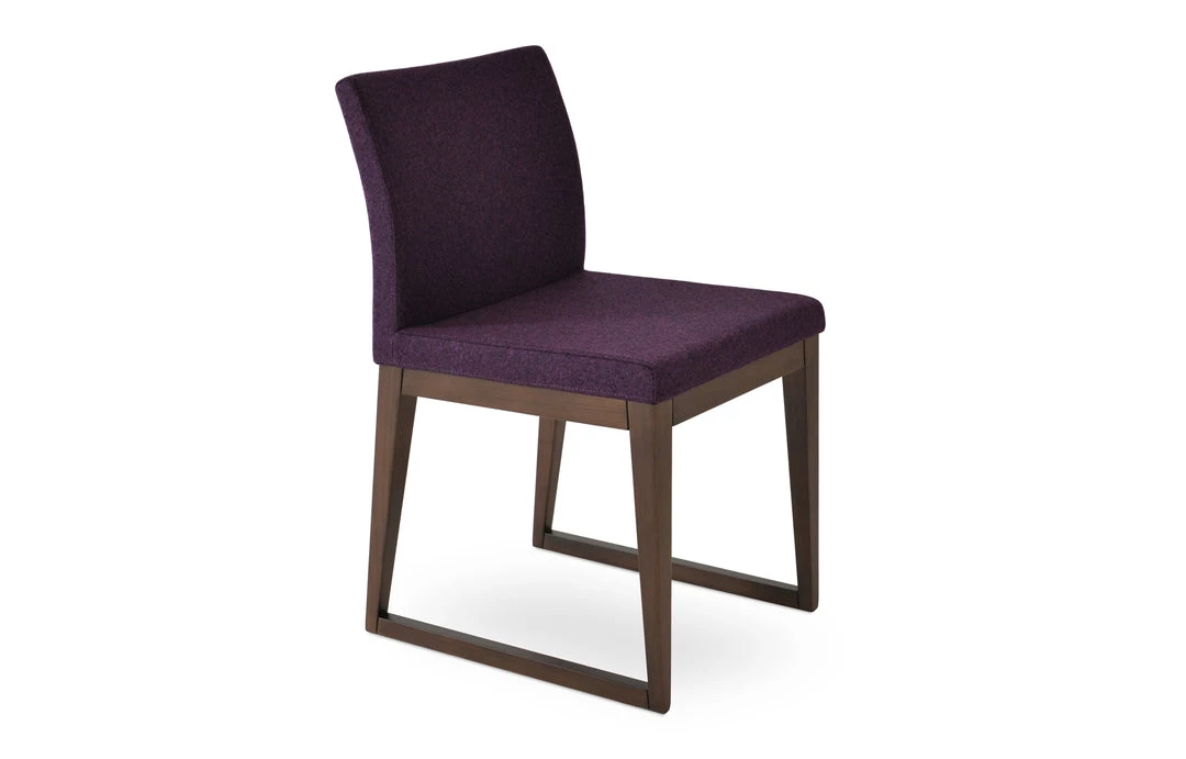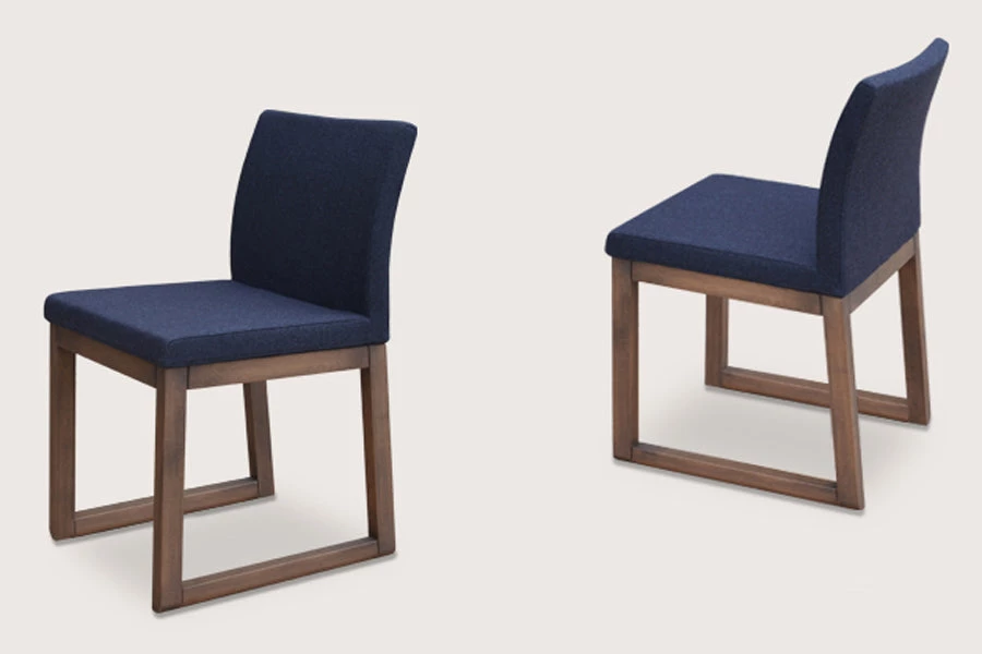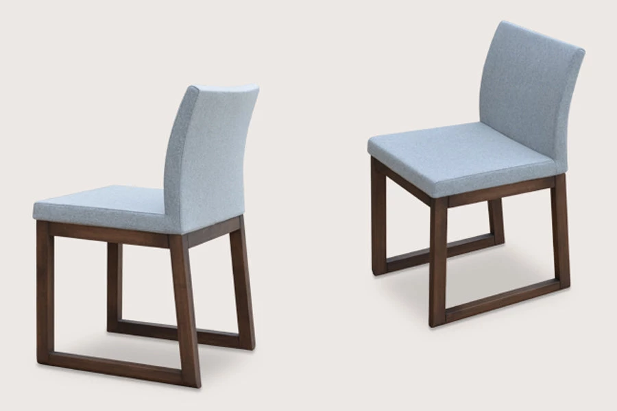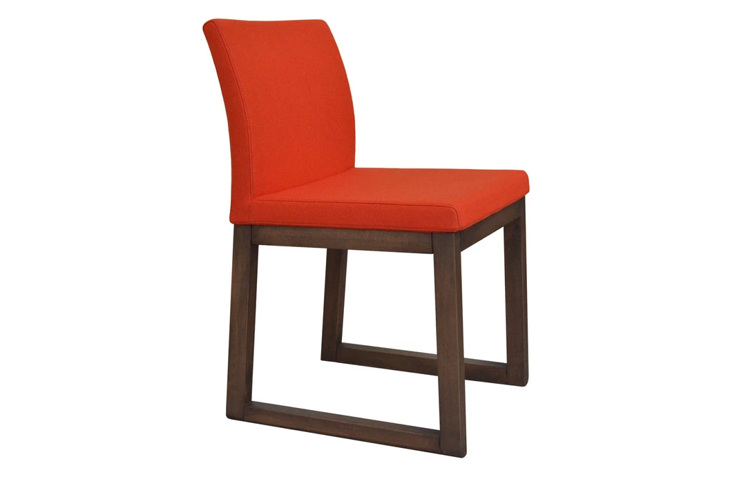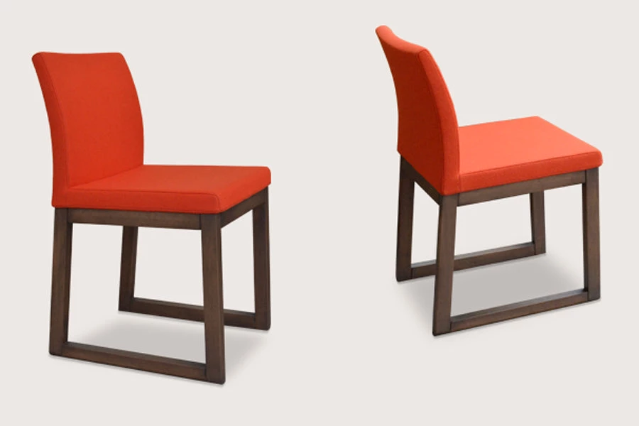 Aria Sled Wood is a contemporary dining chair with a comfortable upholstered seat and backrest on solid beech walnut finish sled base. The seat has a steel structure with “S” shape springs for extra flexibility and strength. This steel frame is moulded by injecting polyurethane foam. Aria Sled Wood seat is upholstered with a removable velcro enclosed fabric, leatherette, PPM, leather or wool fabric slip cover. Other colors are available as a special order with a minimum quantity required. The chair is suitable for both residential and commercial use. It’s sturdiness sled base that moves very smoothly on carpets has the chair especially preffered for lounge, restaurants, and other public areas. Aria Sled Wood is designed by Tayfur Ozkaynak.