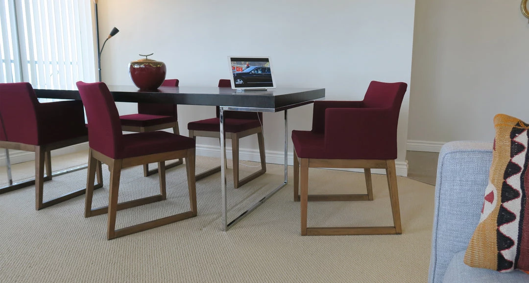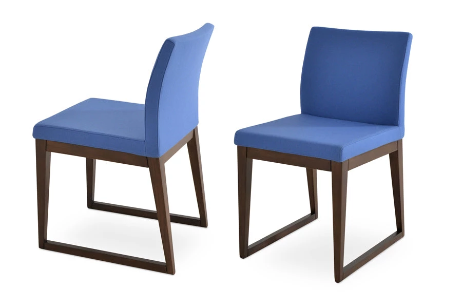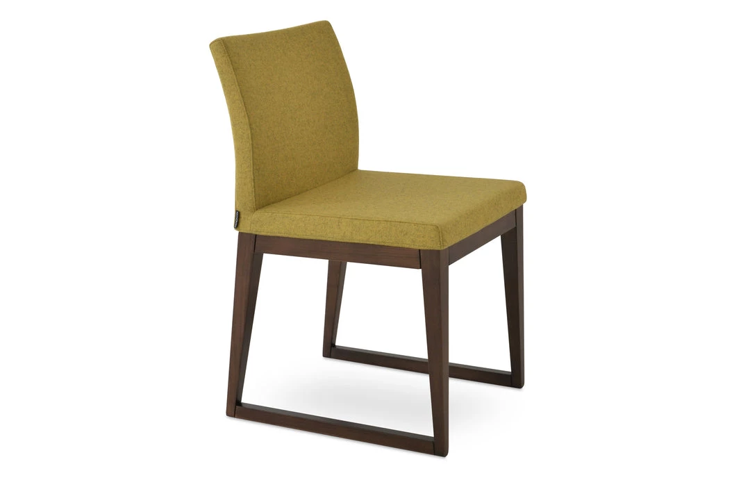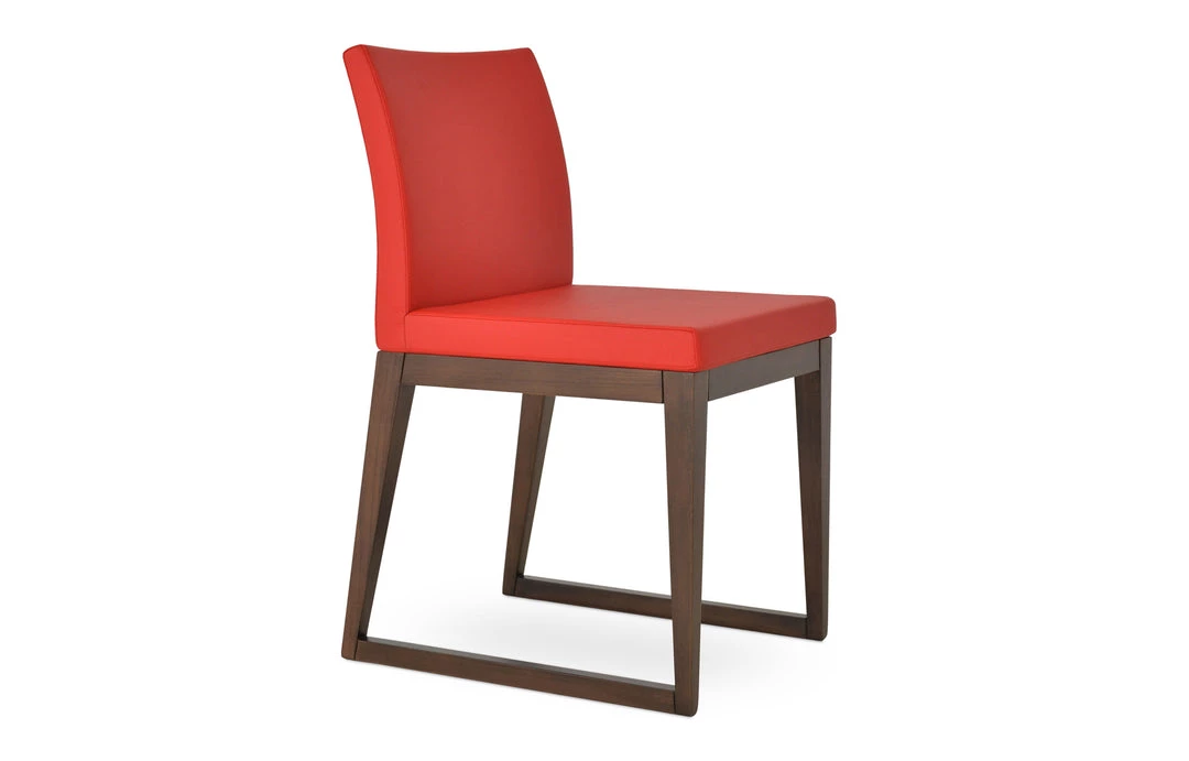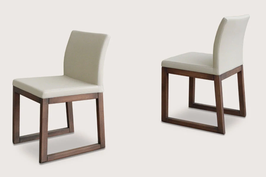 Aria Sled Wood is a contemporary dining chair with a comfortable upholstered seat and backrest on solid beech walnut finish sled base. The seat has a steel structure with “S” shape springs for extra flexibility and strength. This steel frame is moulded by injecting polyurethane foam. Aria Sled Wood seat is upholstered with a removable velcro enclosed fabric, leatherette, PPM, leather or wool fabric slip cover. Other colors are available as a special order with a minimum quantity required. The chair is suitable for both residential and commercial use. It’s sturdiness sled base that moves very smoothly on carpets has the chair especially preffered for lounge, restaurants, and other public areas. Aria Sled Wood is designed by Tayfur Ozkaynak.