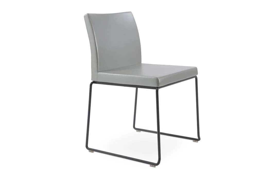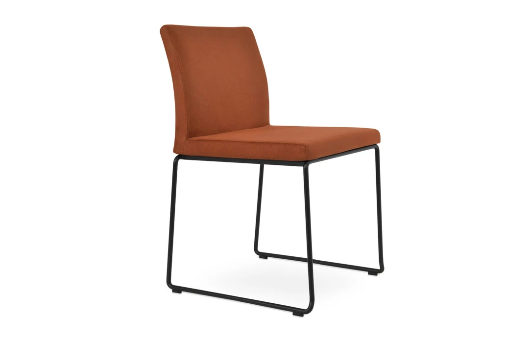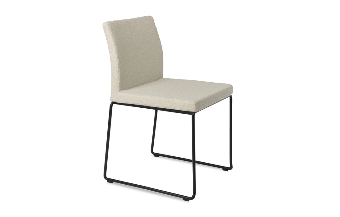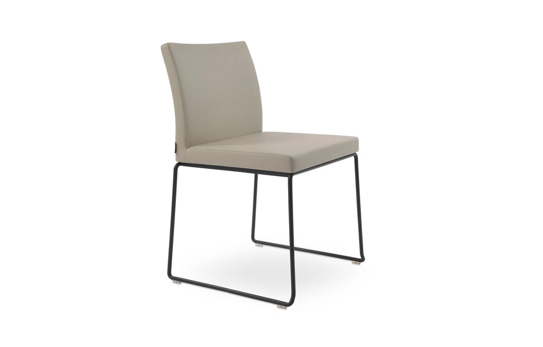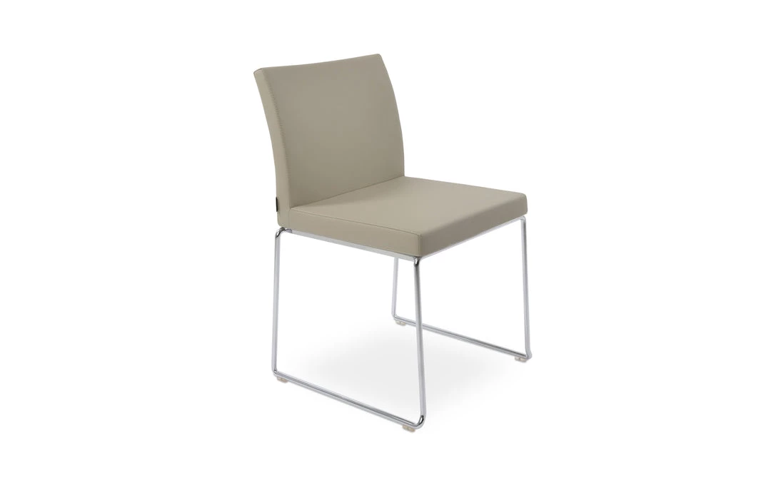Aria Stackable is a contemporary dining chair with a comfortable upholstered seat and backrest on solid stainless steel stackable base. The seat has a steel structure with “S” shape springs for extra flexibility and strength. This steel frame is moulded by injecting polyurethane foam. Aria Slide seat is upholstered with a removable velcro enclosed fabric, leatherette, PPM, leather or wool fabric slip cover. Other colors are available as a special order with a minimum quantity required. The chair is suitable for both residential and commercial use. Aria Sled’s sturdiness sled base that moves very smoothly on carpets has the chair especially preffered for lounge, restaurants, and other public areas. Aria Stackable is designed by Tayfur Ozkaynak.