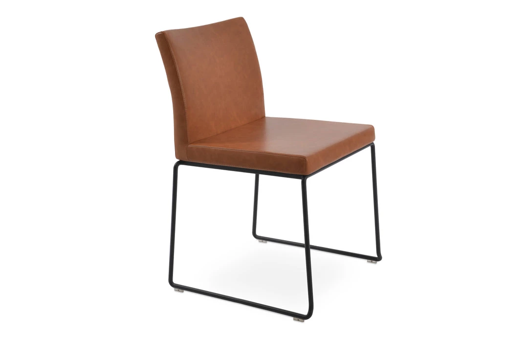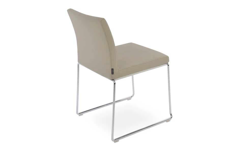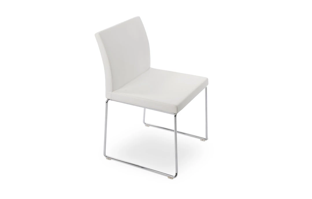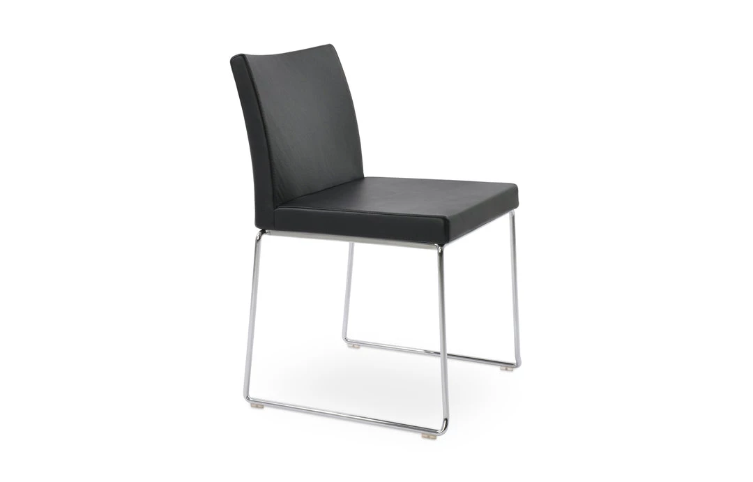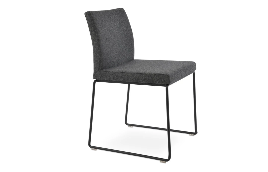 Aria Stackable is a contemporary dining chair with a comfortable upholstered seat and backrest on solid stainless steel stackable base. The seat has a steel structure with “S” shape springs for extra flexibility and strength. This steel frame is moulded by injecting polyurethane foam. Aria Slide seat is upholstered with a removable velcro enclosed fabric, leatherette, PPM, leather or wool fabric slip cover. Other colors are available as a special order with a minimum quantity required. The chair is suitable for both residential and commercial use. Aria Sled’s sturdiness sled base that moves very smoothly on carpets has the chair especially preffered for lounge, restaurants, and other public areas. Aria Stackable is designed by Tayfur Ozkaynak.