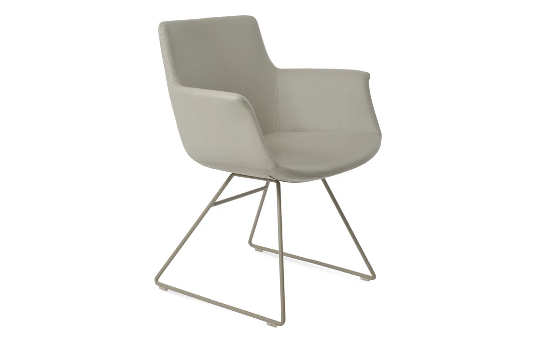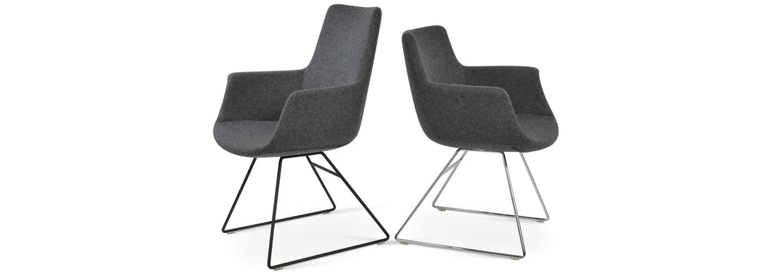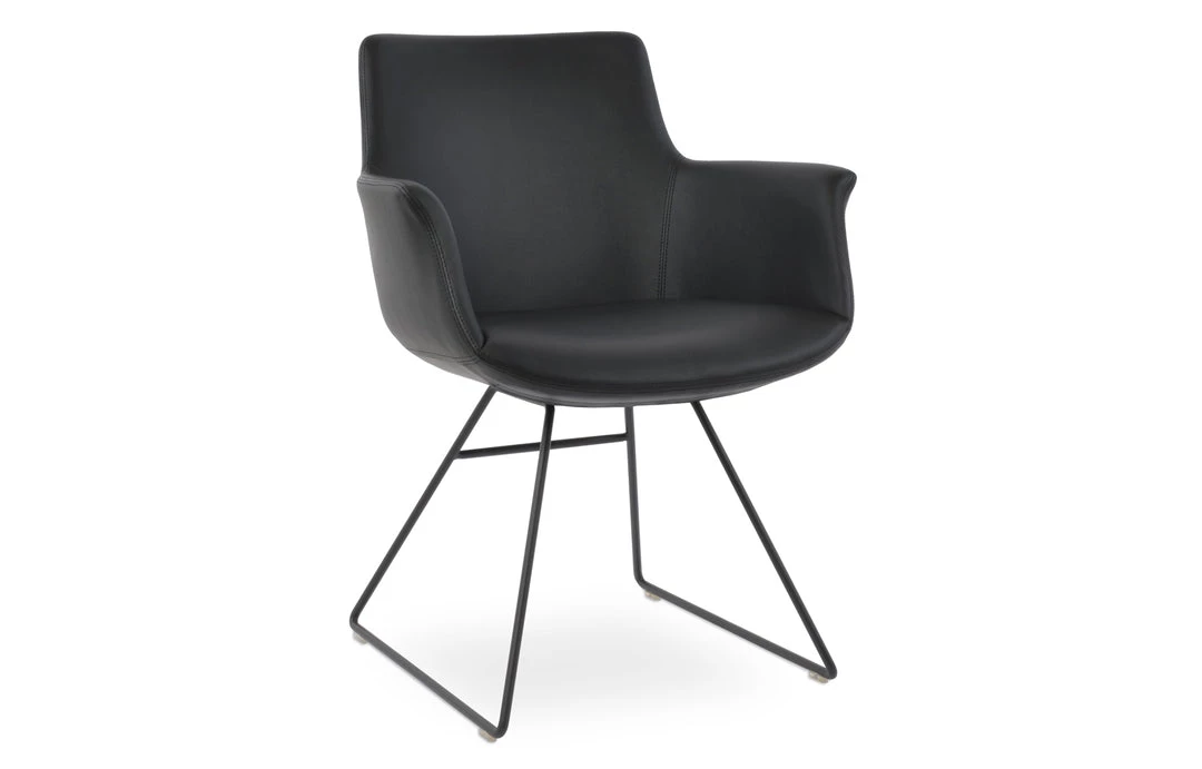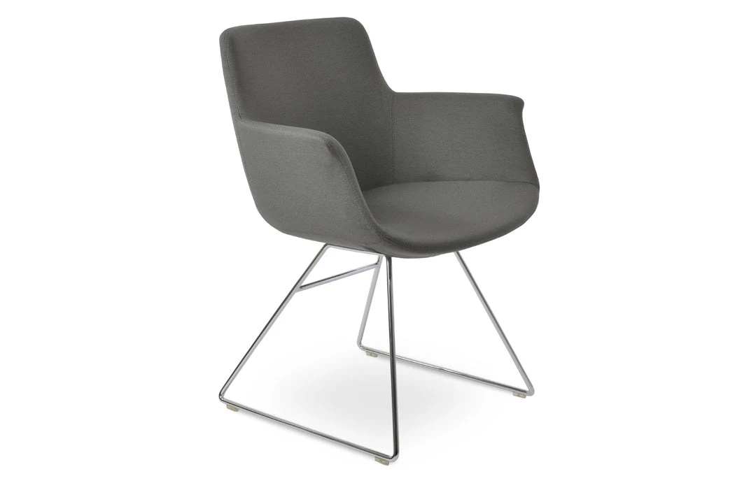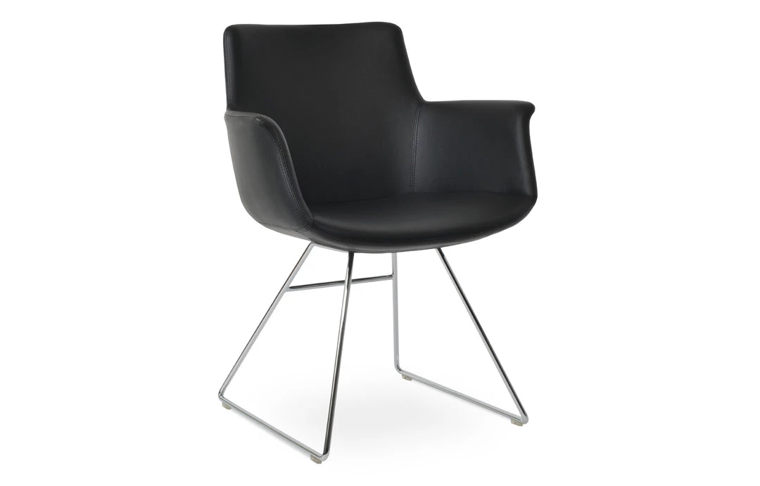 Bottega Wire is a contemporary dining chair with a comfortable upholstered seat and backrest on chrome steel sled base. The steel sled base can be finished in black or white powder coating. Each leg is tipped with a plastic glide embedded into the metal wire. The seat has a steel structure with “S” shape springs for extra flexibility and strength. This steel frame molded by injecting polyurethane foam. Bottega seat is upholstered with a removable zipper enclosed leather, PPM, leatherette or wool fabric slip cover. The chair is suitable for both residential and commercial use. Bottega Wire is designed by Tayfur Ozkaynak.