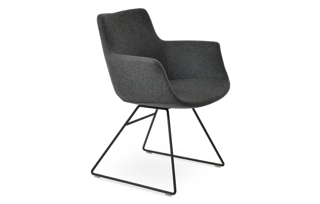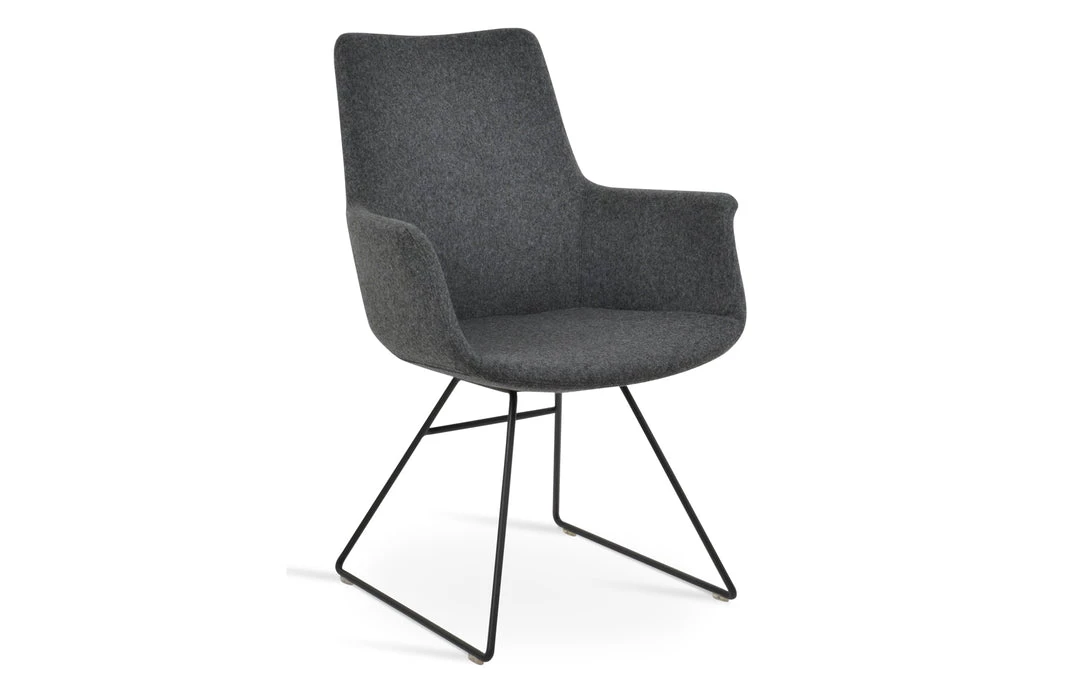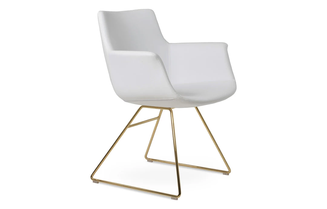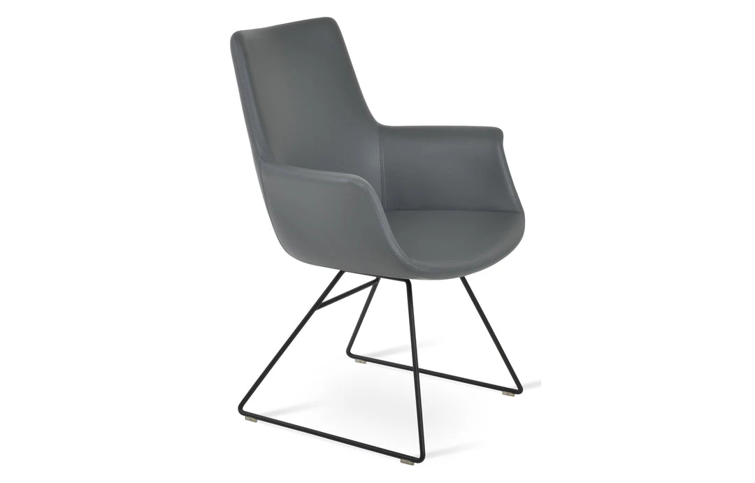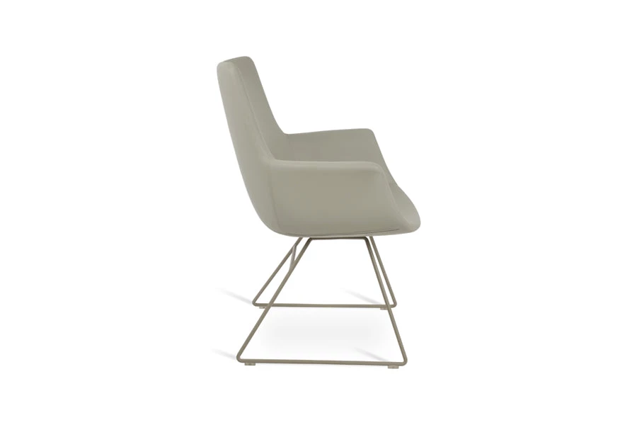 Bottega Wire is a contemporary dining chair with a comfortable upholstered seat and backrest on chrome steel sled base. The steel sled base can be finished in black or white powder coating. Each leg is tipped with a plastic glide embedded into the metal wire. The seat has a steel structure with “S” shape springs for extra flexibility and strength. This steel frame molded by injecting polyurethane foam. Bottega seat is upholstered with a removable zipper enclosed leather, PPM, leatherette or wool fabric slip cover. The chair is suitable for both residential and commercial use. Bottega Wire is designed by Tayfur Ozkaynak.