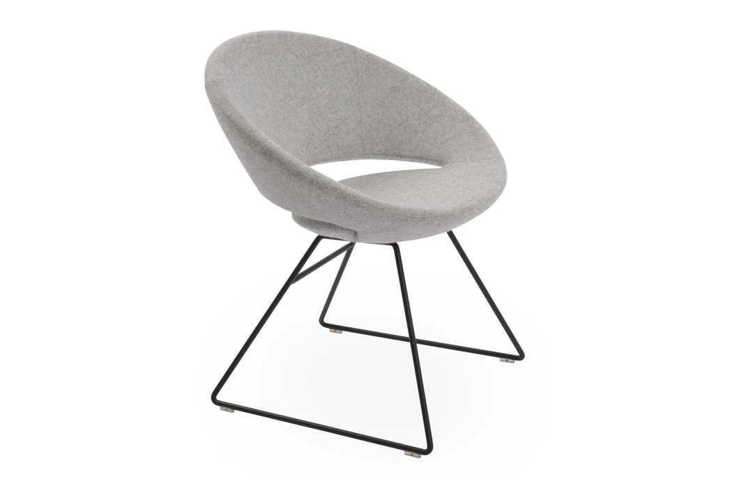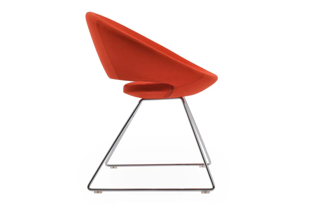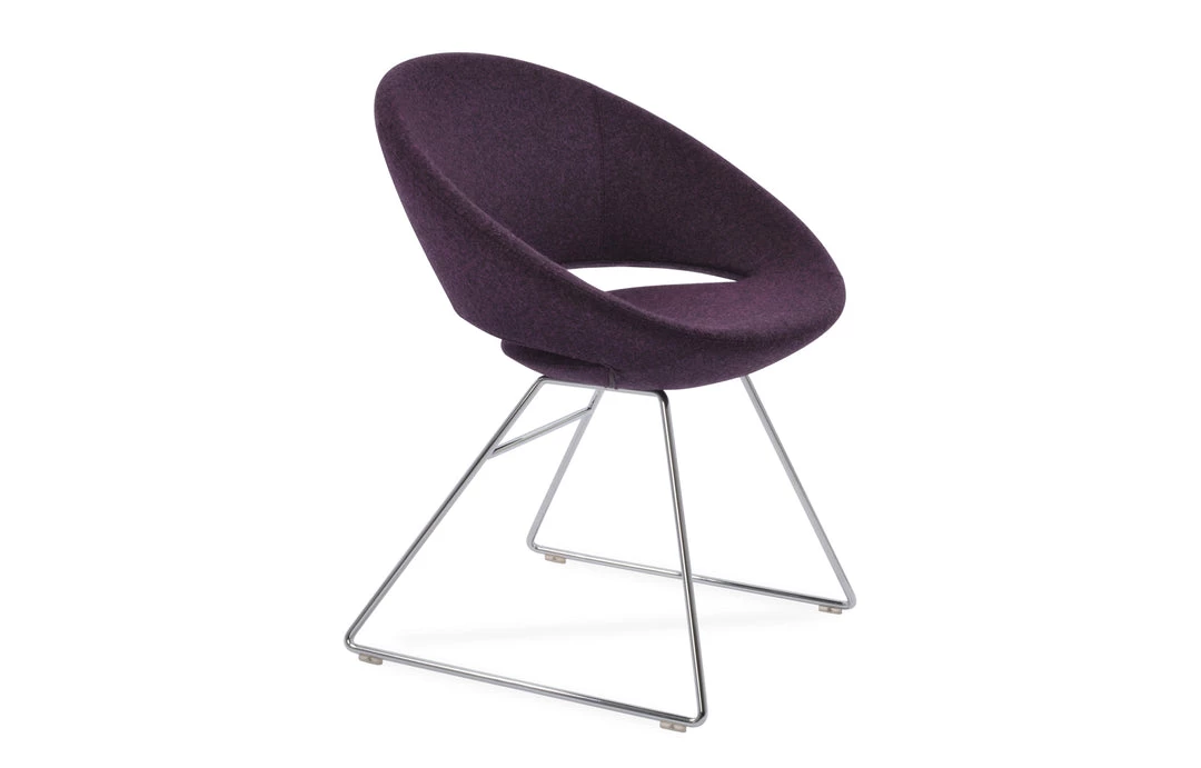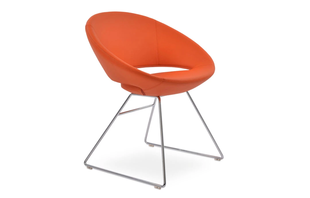 Crescent Wire is a contemporary dining chair with a comfortable upholstered seat and backrest on chrome steel sled base. The steel sled base can be finished in black or white powder coating. Each leg is tipped with a plastic glide embedded into the metal wire. The seat has a steel structure with “S” shape springs for extra flexibility and strength. This steel frame molded by injecting polyurethane foam. Crescent seat is upholstered with a removable zipper enclosed leather, PPM, leatherette or wool fabric slip cover. The chair is suitable for both residential and commercial use. Crescent Wire is designed by Tayfur Ozkaynak.