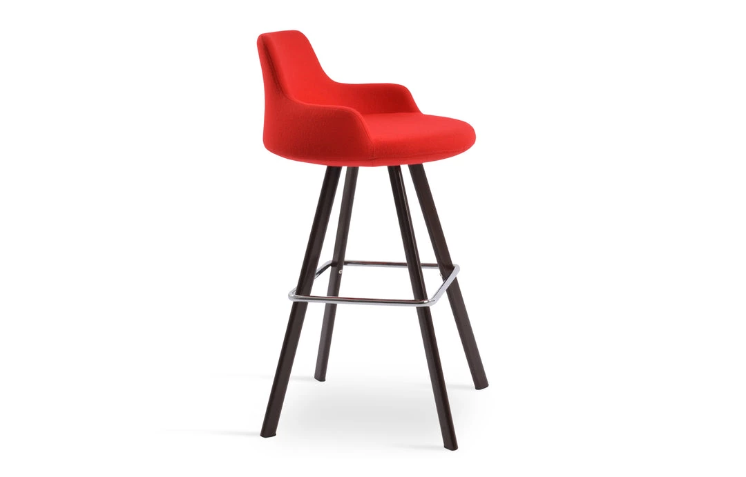 Dervish Sword is a modern stool with a comfortable upholstered seat and backrest on a coated steel frame. Metal legs are available in black powder, natural as well as stainless steel finishes. Each leg is tipped with a plastic glide inserted to the foot. With its chromed steel tubular footrests, it becomes an ideal solution for kitchen and bar counters. The footrests are fixed inside the four-leg frame. The seat has a steel structure with “S” shape springs for extra flexibility and strength. This steel frame is molded by injecting polyurethane foam. Dervish Sword stool are available with swivel seat options too. Dervish Sword stool is designed by sohoConcept team.
