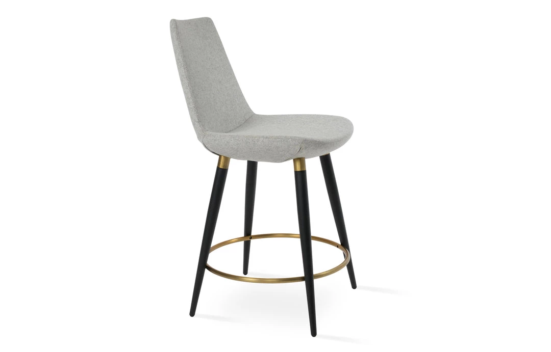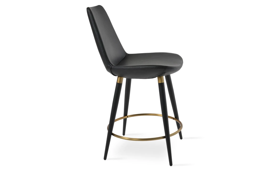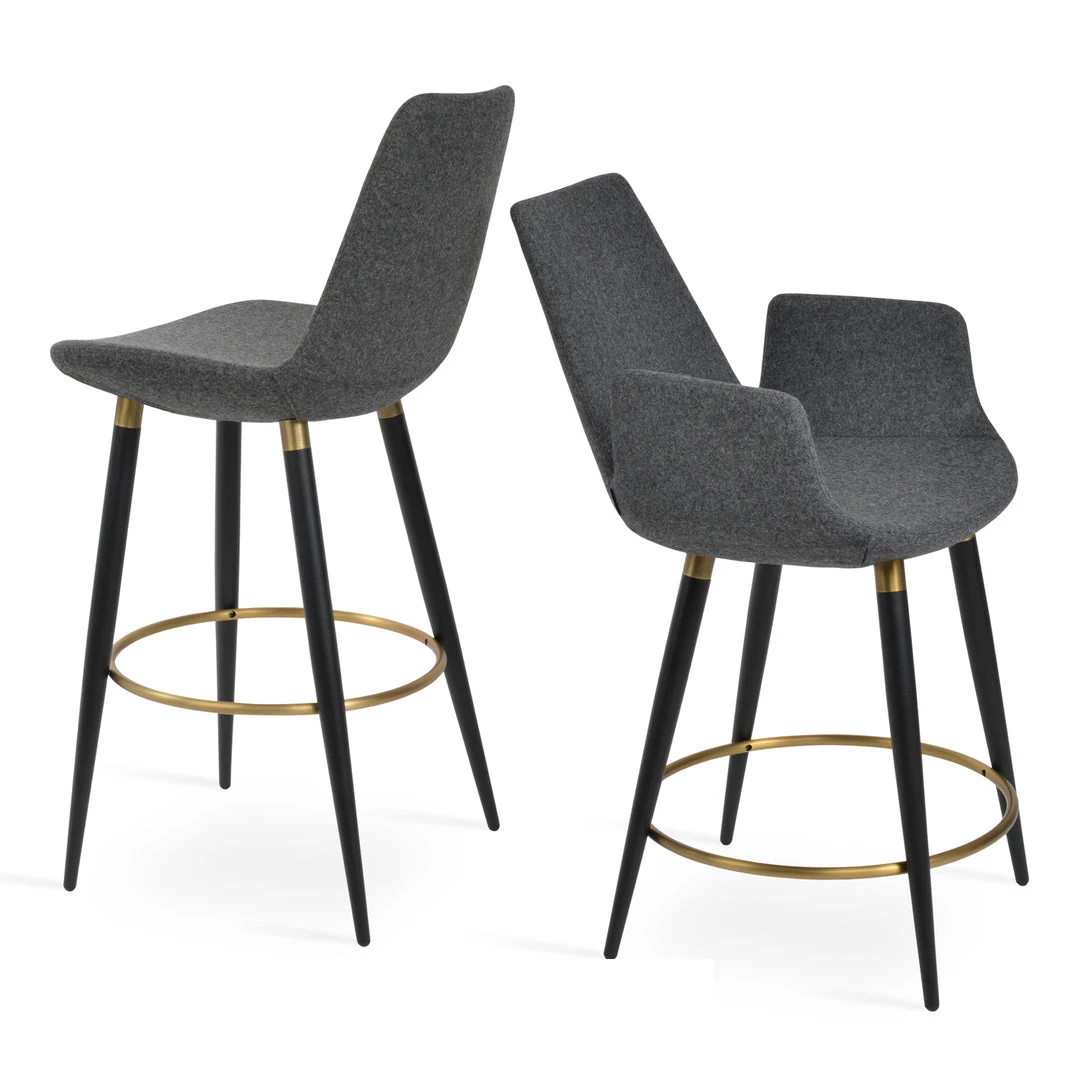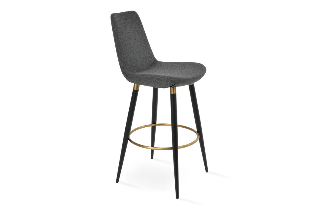 Eiffel Ana is a unique stool with a comfortable upholstered seat and backrest on steel legs available in black powder with gold bracelets and footrest and walnut veneer with stainless steel brushed bracelets and footrest. Each leg is tipped with a plastic glide inserted to the foot. The footrests are fixed inside the four-leg frame. The seat has a steel structure with “S” shape springs for extra flexibility and strength. This steel frame molded by injecting polyurethane foam. Eiffel seat is upholstered with a removable slip cover. The stool is suitable for both residential and commercial use and can be ordered as counter or bar stool. Eiffel Ana stool is designed by sohoConcept team.