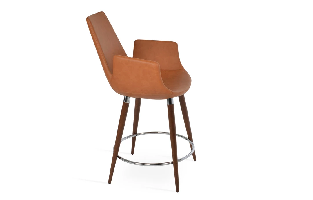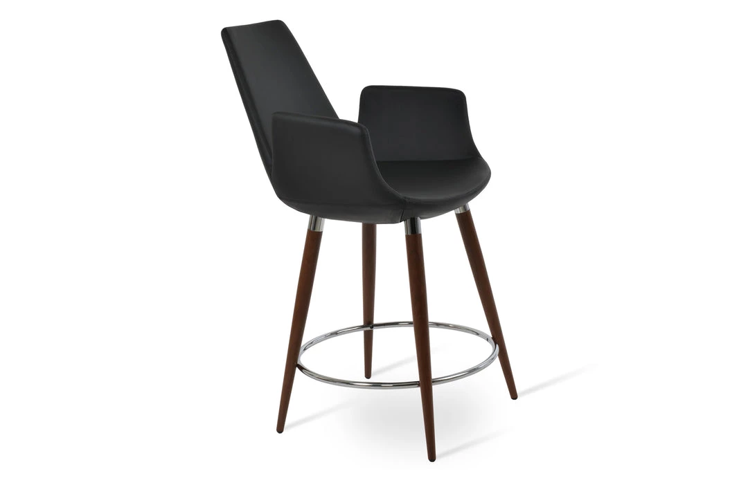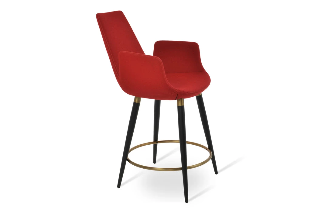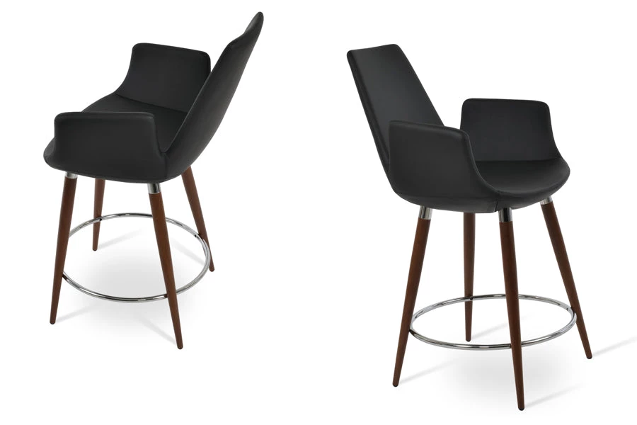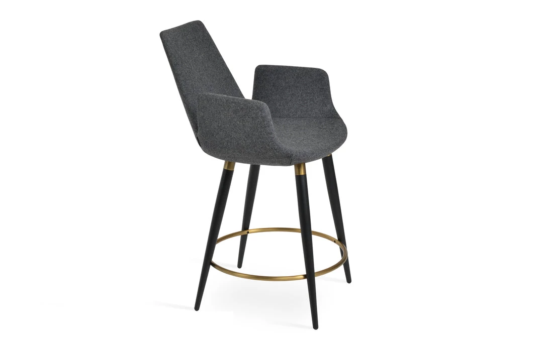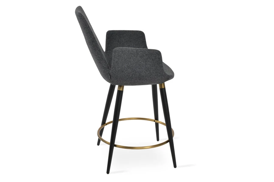 Eiffel Arm Ana is a unique stool with a comfortable upholstered seat and backrest on steel legs available in black powder with gold bracelets and footrest and walnut veneer with stainless steel brushed bracelets and footrest. Each leg is tipped with a plastic glide inserted to the foot. The footrests are fixed inside the four-leg frame. The seat has a steel structure with “S” shape springs for extra flexibility and strength. This steel frame molded by injecting polyurethane foam. Eiffel Arm seat is upholstered with a removable slip cover. The stool is suitable for both residential and commercial use and can be ordered as counter or bar stool. Eiffel Arm Ana stool is designed by sohoConcept team.