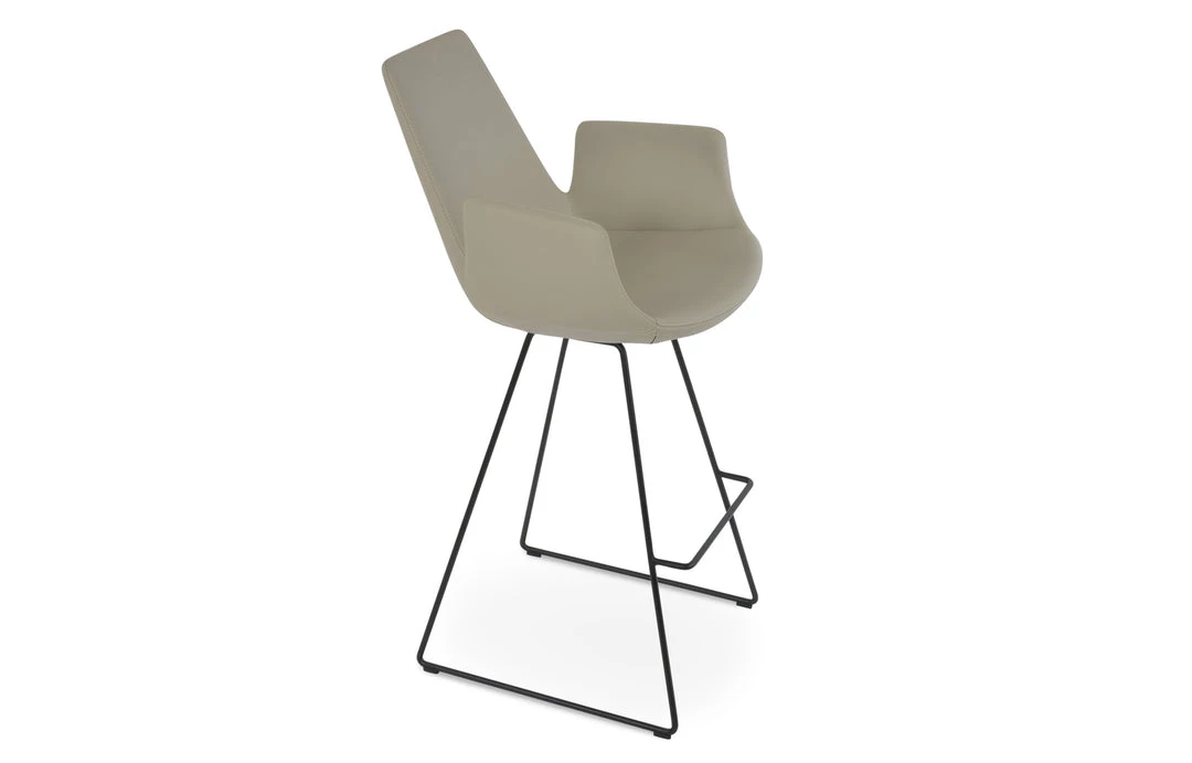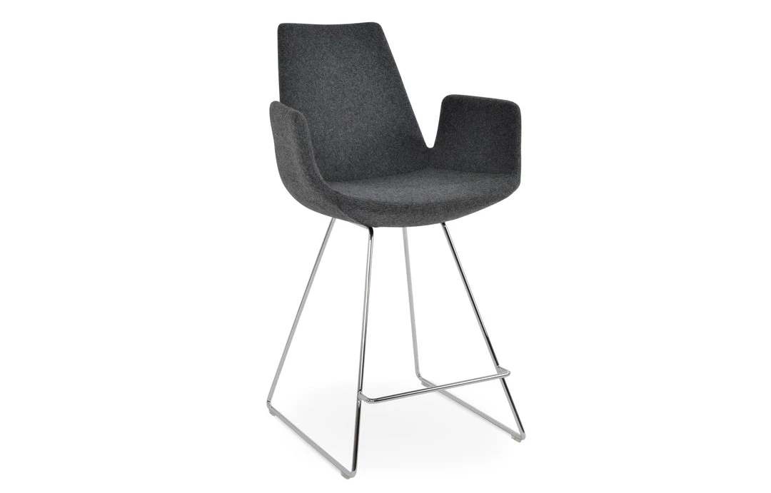 Eiffel Arm Wire is a contemporary counter and bar stool with a comfortable upholstered seat and backrest on solid chrome steel sled base. Each leg is tipped with a plastic glide embedded into the metal wire. The seat has a steel structure with “S” shape springs for extra flexibility and strength. This steel frame molded by injecting polyurethane foam. Eiffel seat is upholstered with a removable velcro, enclosed leather, PPM, leatherette, wool as well as Camira organic wool slip cover. Eiffel Arm Wire Stools may be upholstered with variety of other colors as a special order with a minimum of quantity required. The stool is suitable for both residential and commercial use. Eiffel Arm Wire Stool is designed by the sohoConcept team.