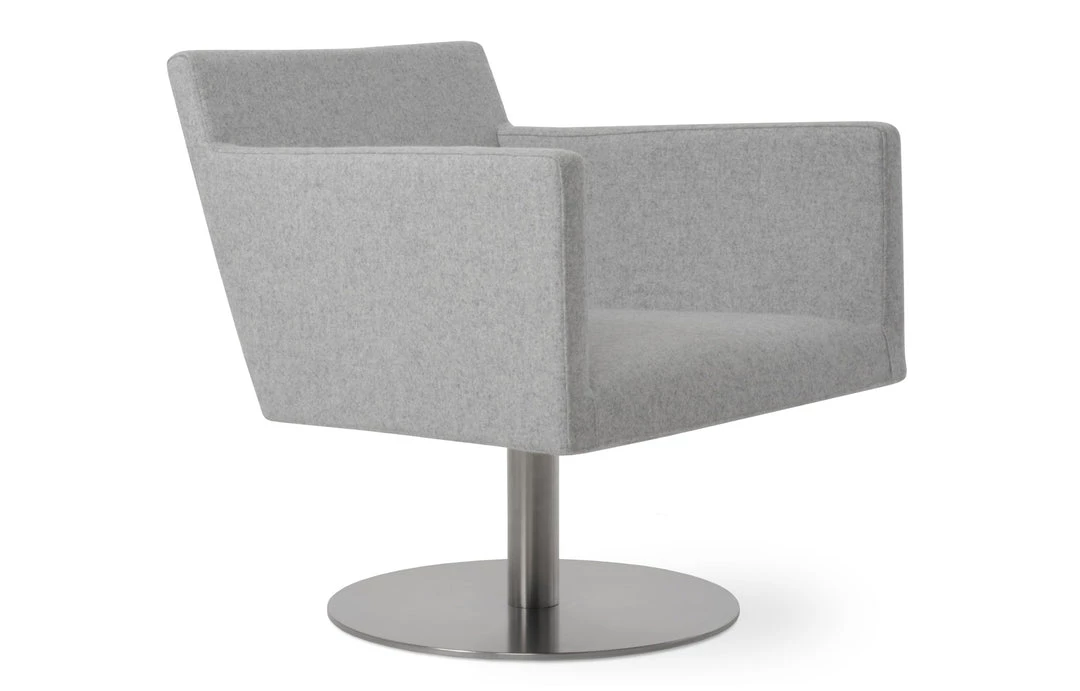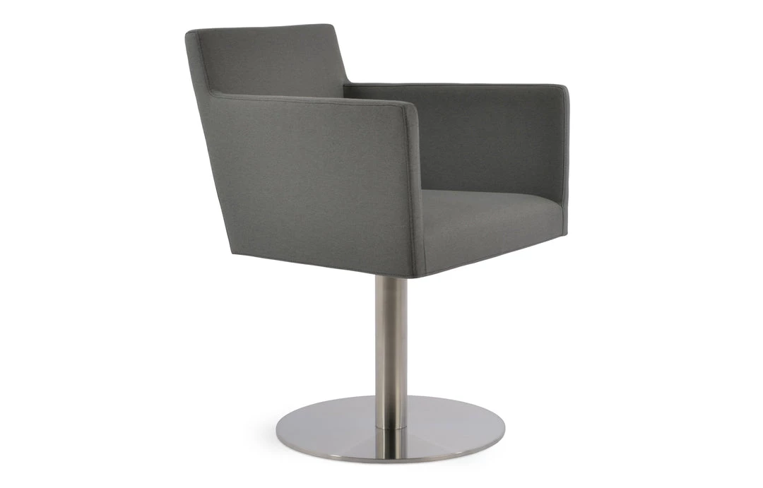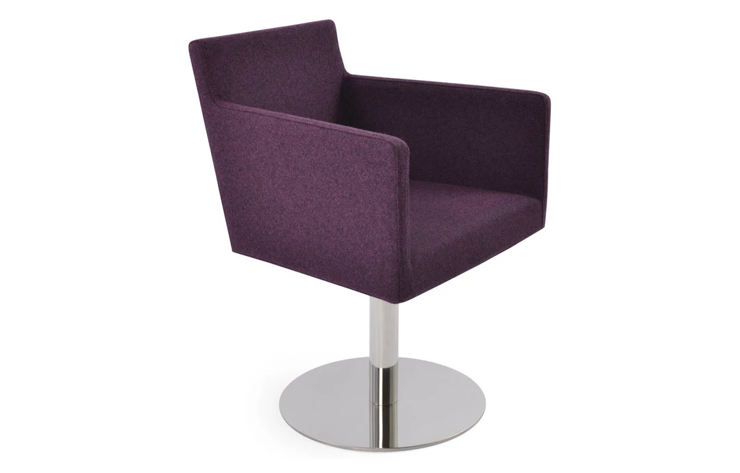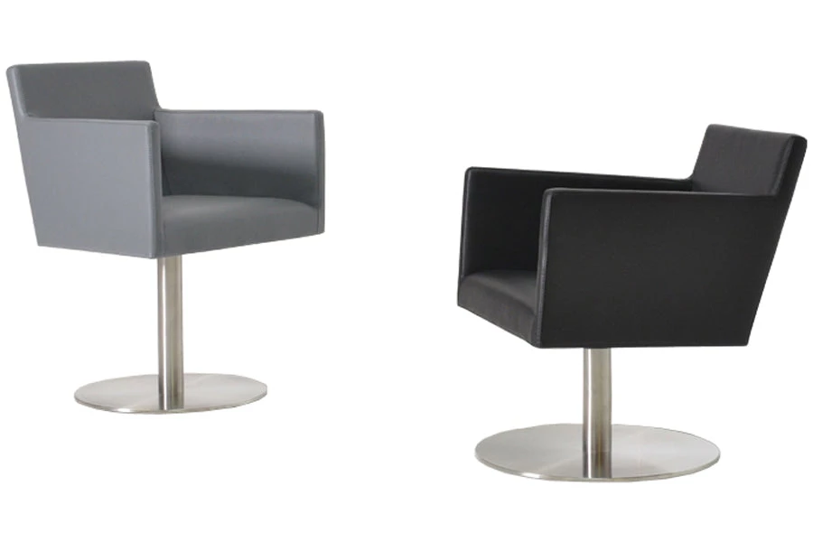 Harput Round is a contemporary armchair with a comfortable upholstered seat and backrest on solid swivel stainless steel or chrome with screwed plastic caps under the base. The seat has a steel structure with “S” shape springs for extra flexibility and strength. This steel frame molded by injecting polyurethane foam. Harput seat is upholstered with a removable velcro enclosed leather, leatherette or wool fabric slip cover. Harput chair is available in Camira Wool CUZ68 and CUZ15. Other colors of Camira fabrics are available only for special orders. Camira Fabrics are 5 year guaranteed from the date of invoice against wear through (the complete deterioration of the fabric’s structure in a particular area) and loss of colorfastness (the excessive loss of color due to exposure to light). PPM Leatherette is under a 5 year guarantee against wear through. The chair is suitable for both residential and commercial use. Harput Round Chair is designed by Tayfur Ozkaynak.