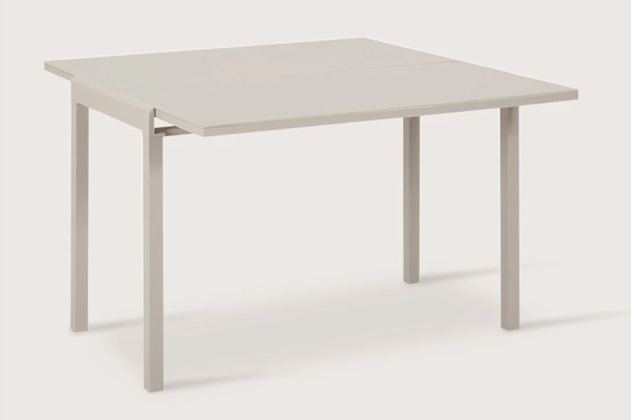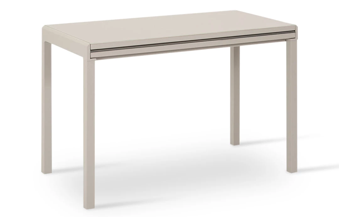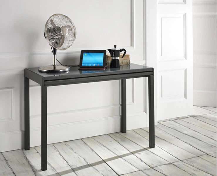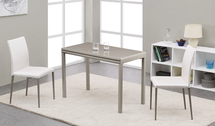 Modern is a contemporary extendable table/desk with champagne or white frosted tempered glass that sits on a champagne sanding powder coating metal frame. Modern table is a great solution for small spaces.