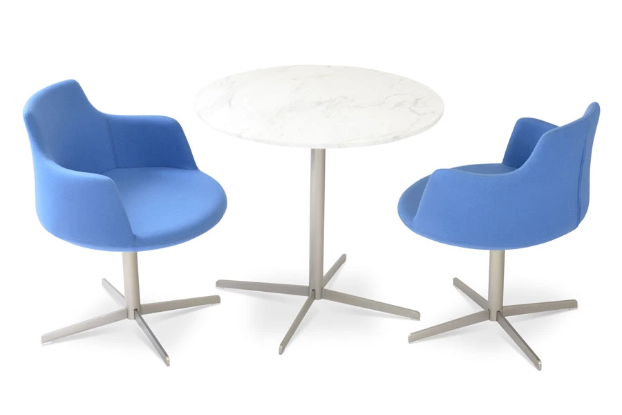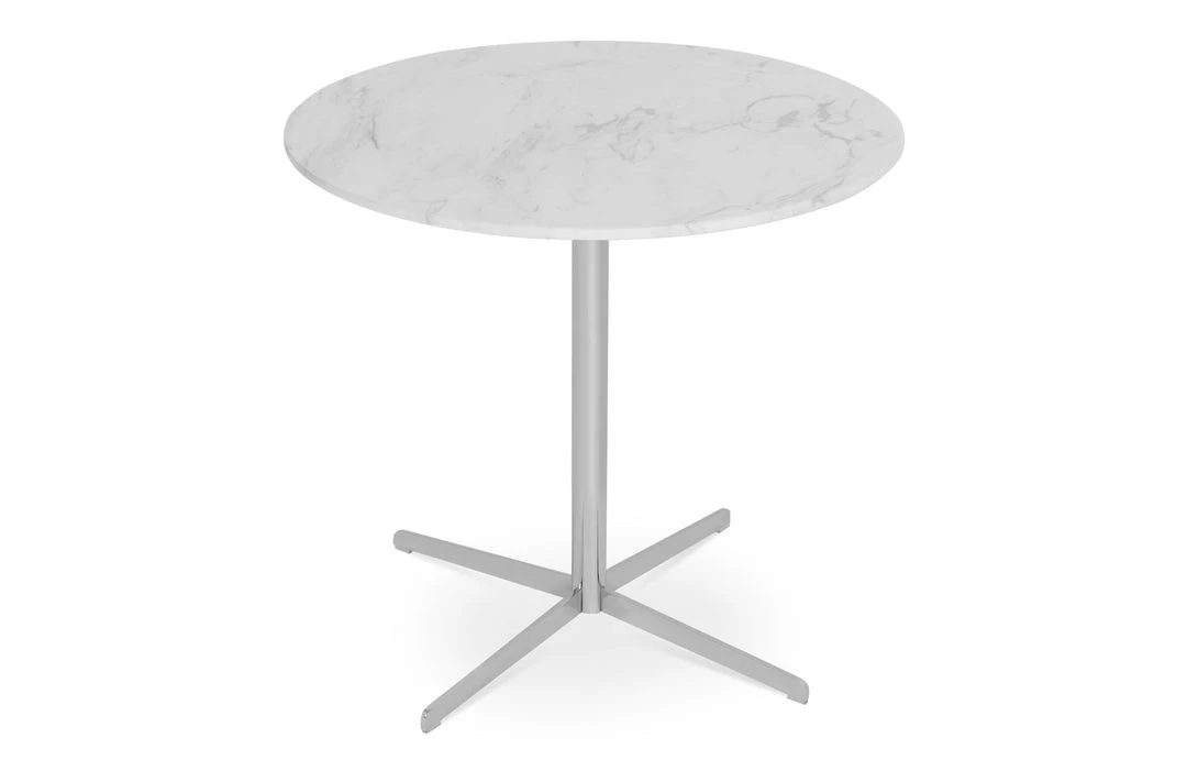 Simple and functional, Diana Table demonstrates refined design features with its chrome 4 star base. It is offered in three different heights and several different glass top size options. The top is available in clear glass, marble and wood finishes. The table arrives in 3 boxes. Every table top is made out of natural stone and therefore each top is different and unique. Variations of color are inherent to the natural stone and considered part of the top’s beauty. Diana Table is suitable for both residential and commercial applications. Diana Table is designed by Namik Ozkaynak.