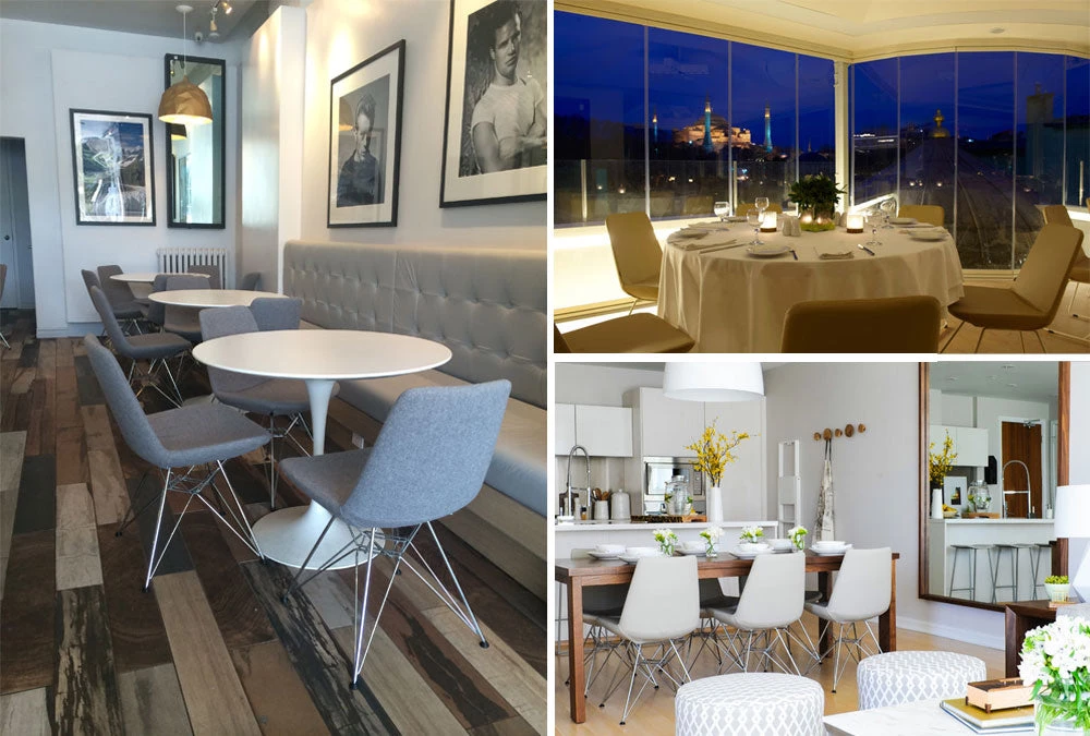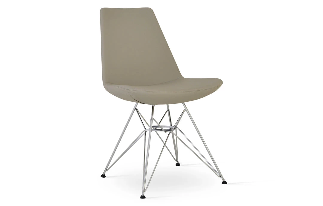 Eiffel Tower is a contemporary dining chair with a comfortable upholstered seat and backrest on chrome steel base as well as brushed black, white, red and gold options. The legs have adjustable, plastic capped pod feet. The seat has a steel structure with “S” shape springs for extra flexibility and strength. This steel frame molded by injecting polyurethane foam. Eiffel seat is upholstered with a removable velcro, enclosed leather, PPM, leatherette, wool as well as Camira organic wool slip cover. Eiffel Tower may be upholstered with variety of other colors as a special order with a minimum of quantity required. The chair is suitable for both residential and commercial use. Eiffel Tower is designed by the sohoConcept team.