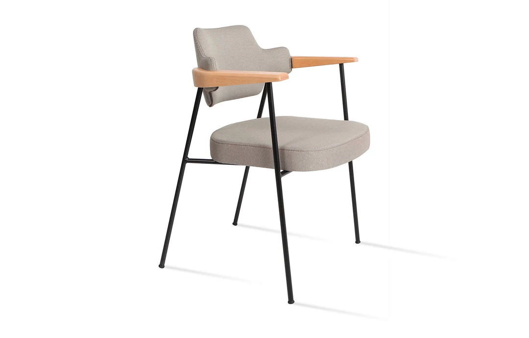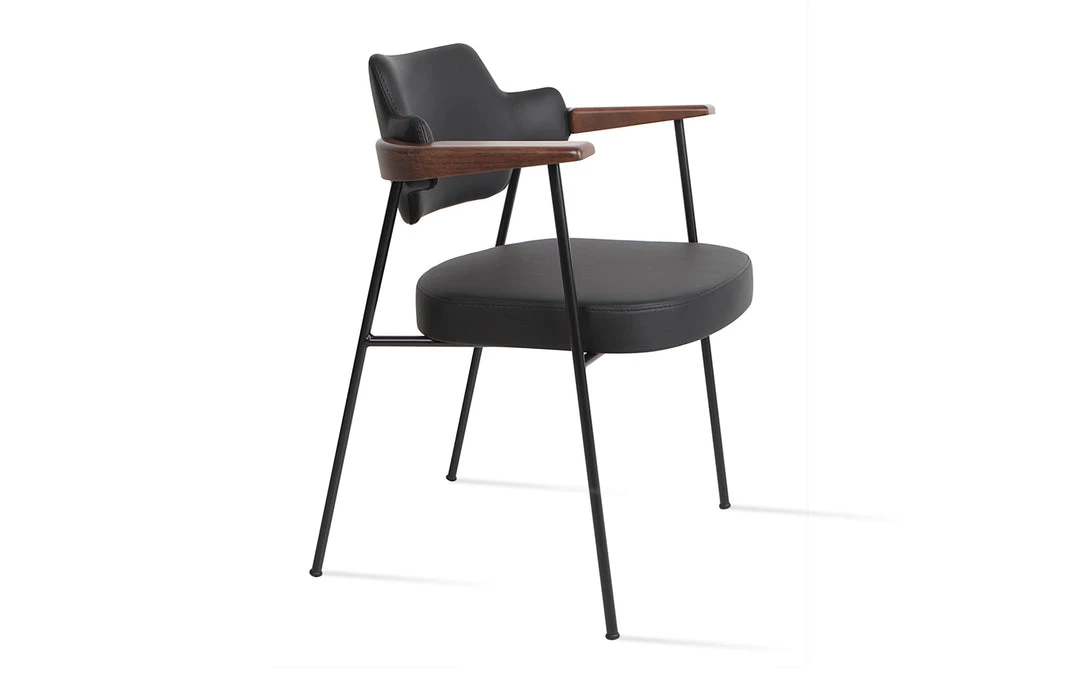 Palu is an industry style dining chair with a upholstered seat and back. The metal legs are finished in matt black and the arms are wood finished in walnut and natural finish. Palu is designed by the Industrial Modern team and it’s suitable for both residential and commercial use.